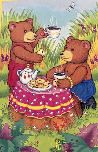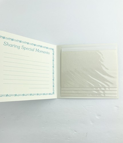 Cover has a boy and girl bear having a tea party in a meadow as a dragonfly hovers overhead and a frog waits patiently at their feet for scraps. Holds eight pictures 3.5 x 5 inches. Has a place for recording photo captions on the back page and the front inside cover is titled Sharing Special Moments and has lined space for you to write your thoughts. Outside dimensions are 5.75" wide and 5 1/8th tall. Includes envelope for mailing. Outer cover is in blue.