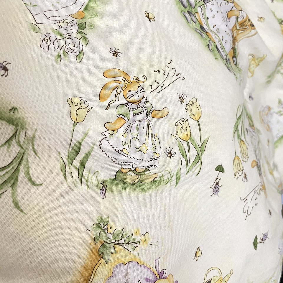 Print on one side is Bunnies By The Bay fabric and on the back is a Circus Elephant balancing on a unicycle wearing a polka dot bow tie and saddle shoes. Lace edging on 3 sides.