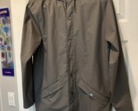 Men's waterproof raincoat by RAINS in taupe color. Features a hood with adjustable drawstrings, snap button front closure, and two front flap pockets with snap buttons.