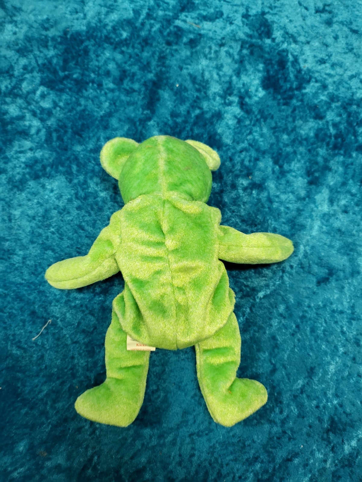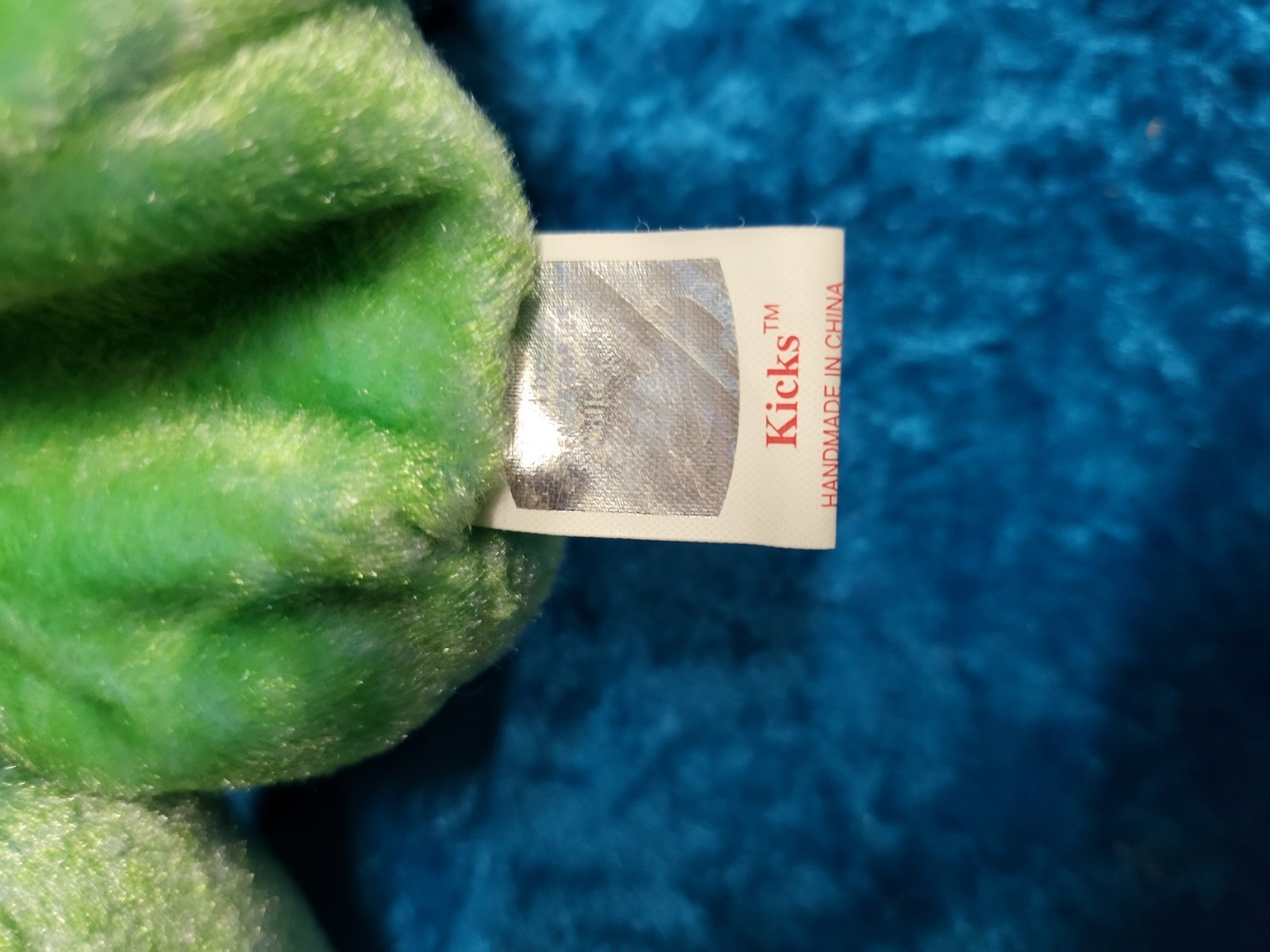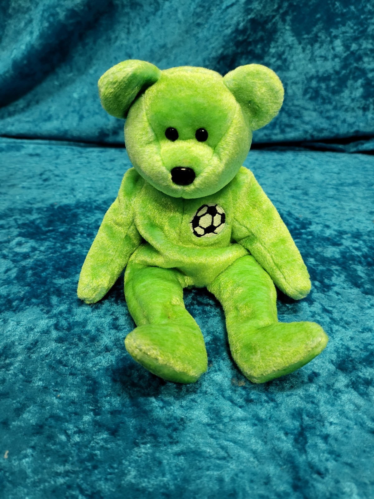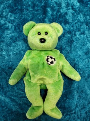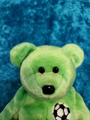 This product is a rare Ty Beanie Baby from 1998 named "Kicks" the Soccer Bear. It is part of the Beanie Babies collection and features tag errors.. This unique item is highly sought after by collectors of original Ty Beanie Babies and would make a valuable addition to any toy or hobby collection.