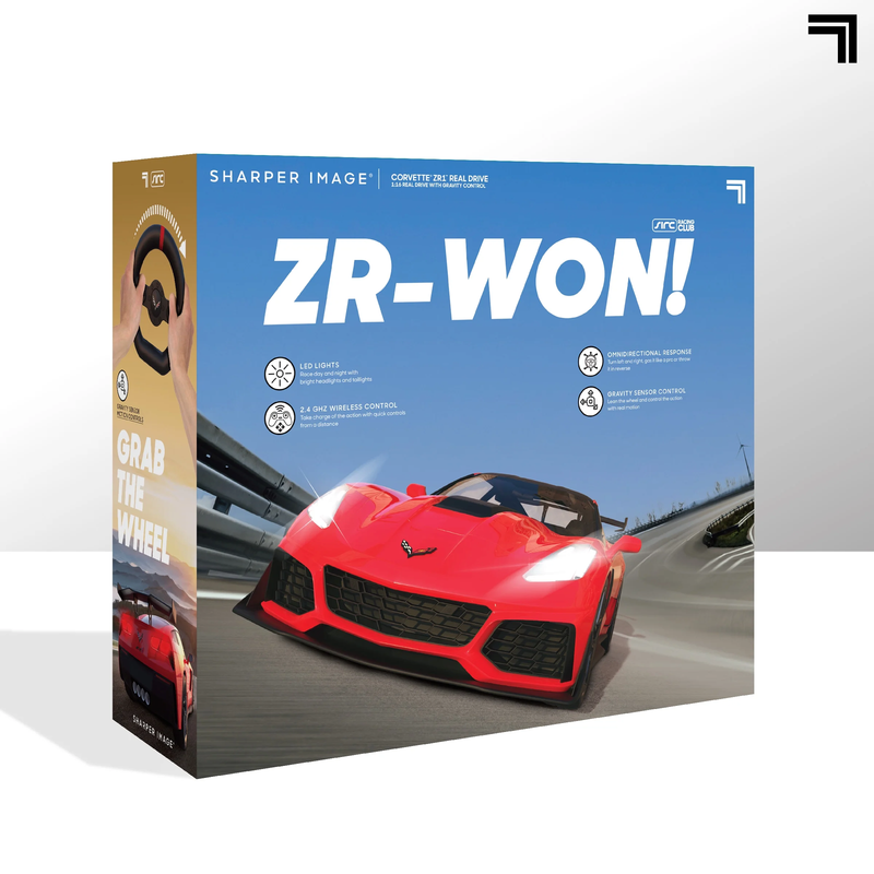 The steering wheel controller comes equipped with two ways to control the sports car. Beginners can use the intuitive arrow buttons to drive forward, back, and side to side. More advanced drivers can use the gravity sensors to turn the steering wheel right or left and control the car in real time! Sharper Image has teamed up with Chevy to provide everyone the opportunity to own their very own supercar. The Chevrolet Corvette ZR1 is a high-performance machine capable of high speeds and tight turns, we packed that performance into a 1:16 scale model for at home enjoyment for all. The fun does not have to stop when the sun goes down. Use the built-in functional headlights to illuminate the path for an evening drive! The lights help you avoid obstacles and hazards on the roadway while achieving top speeds. Recommended for children 6+.