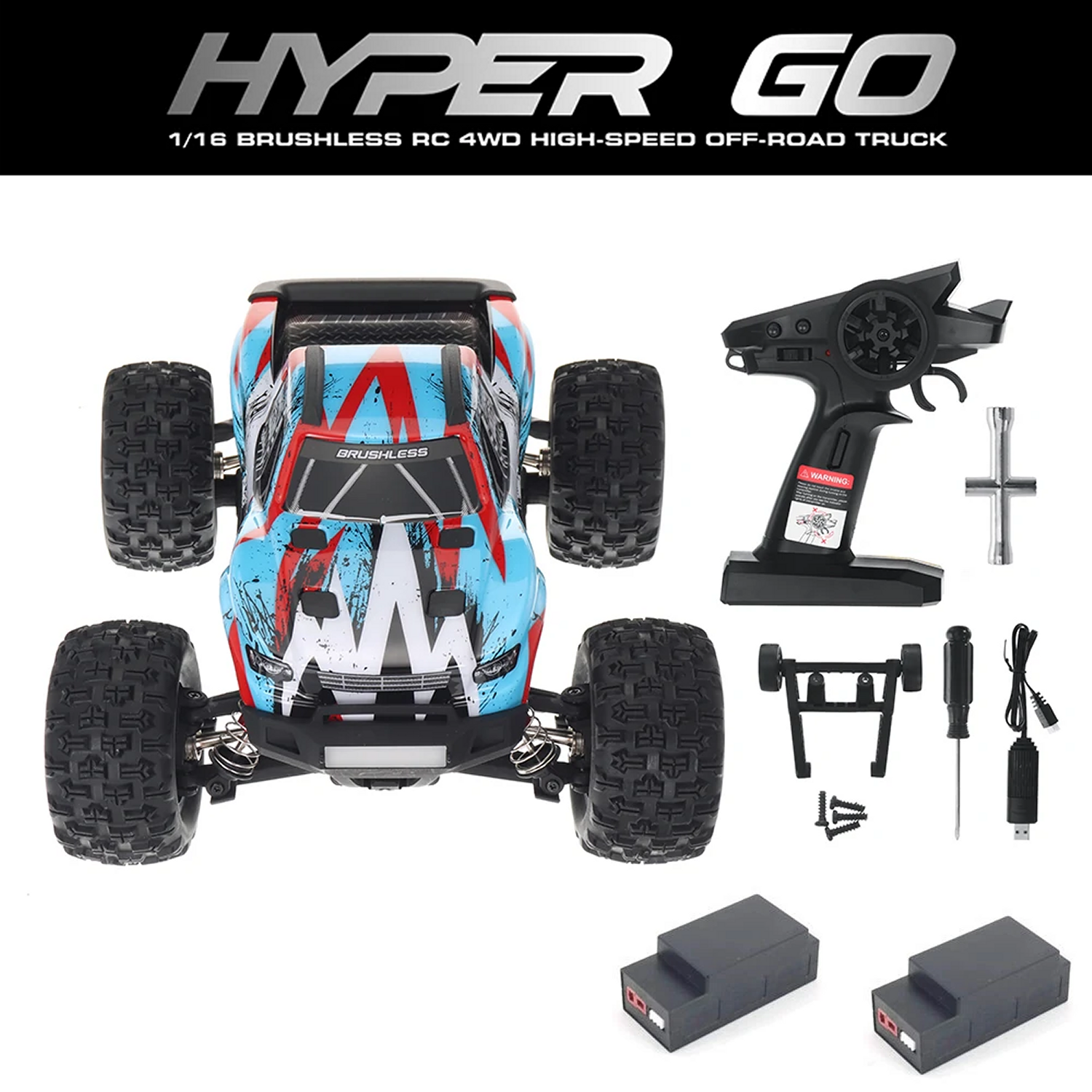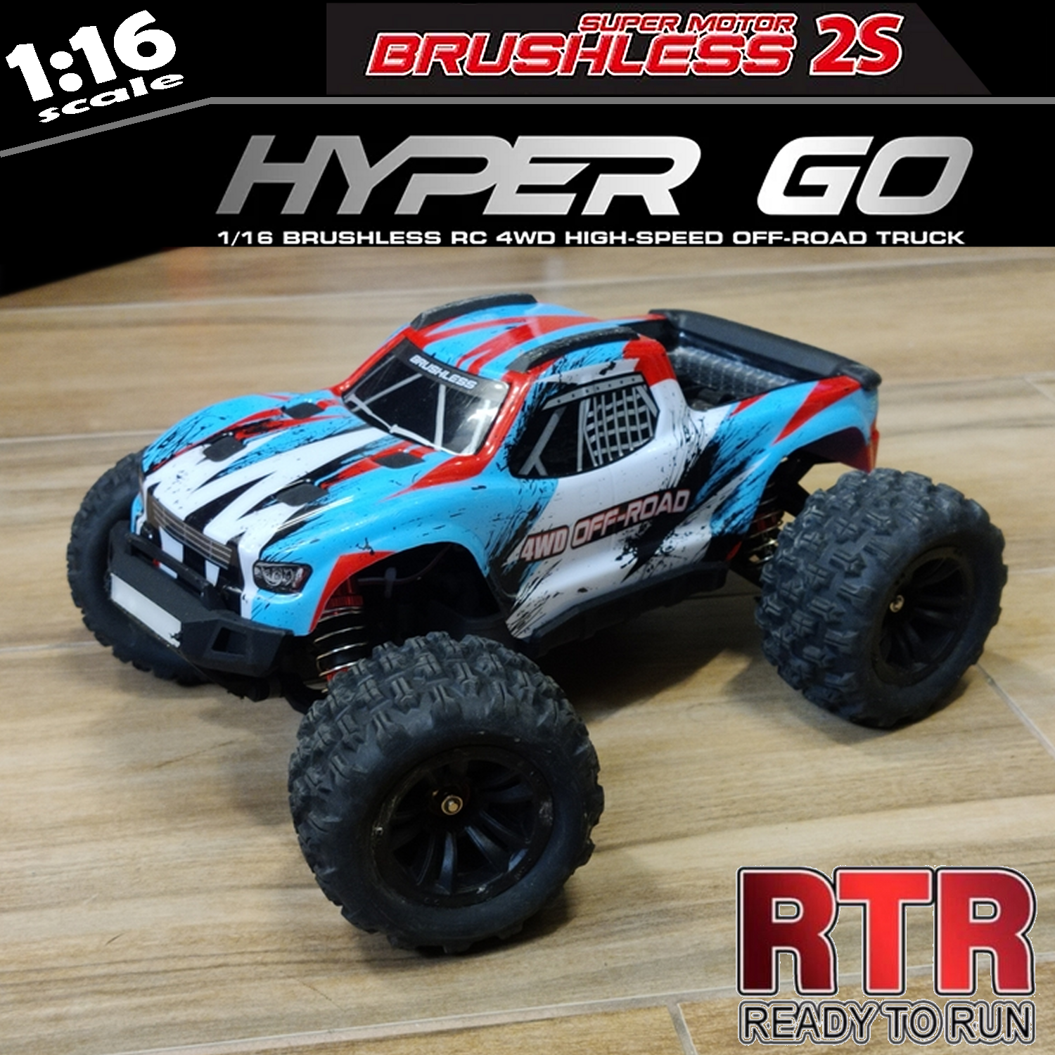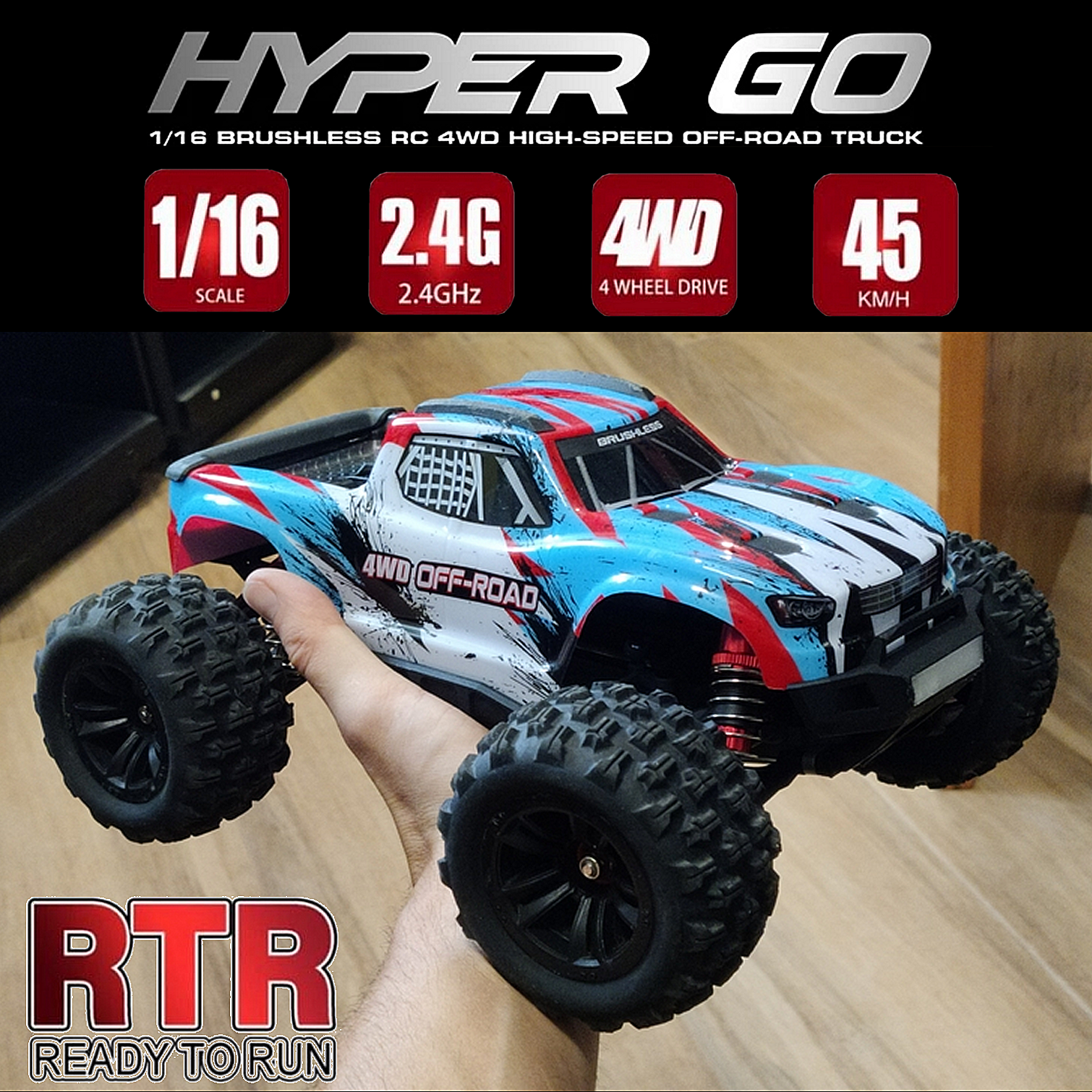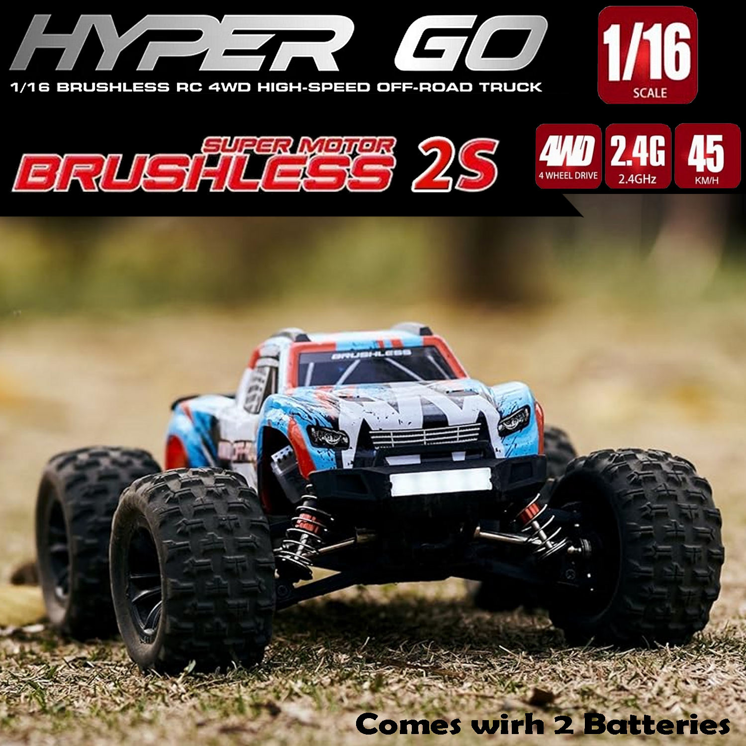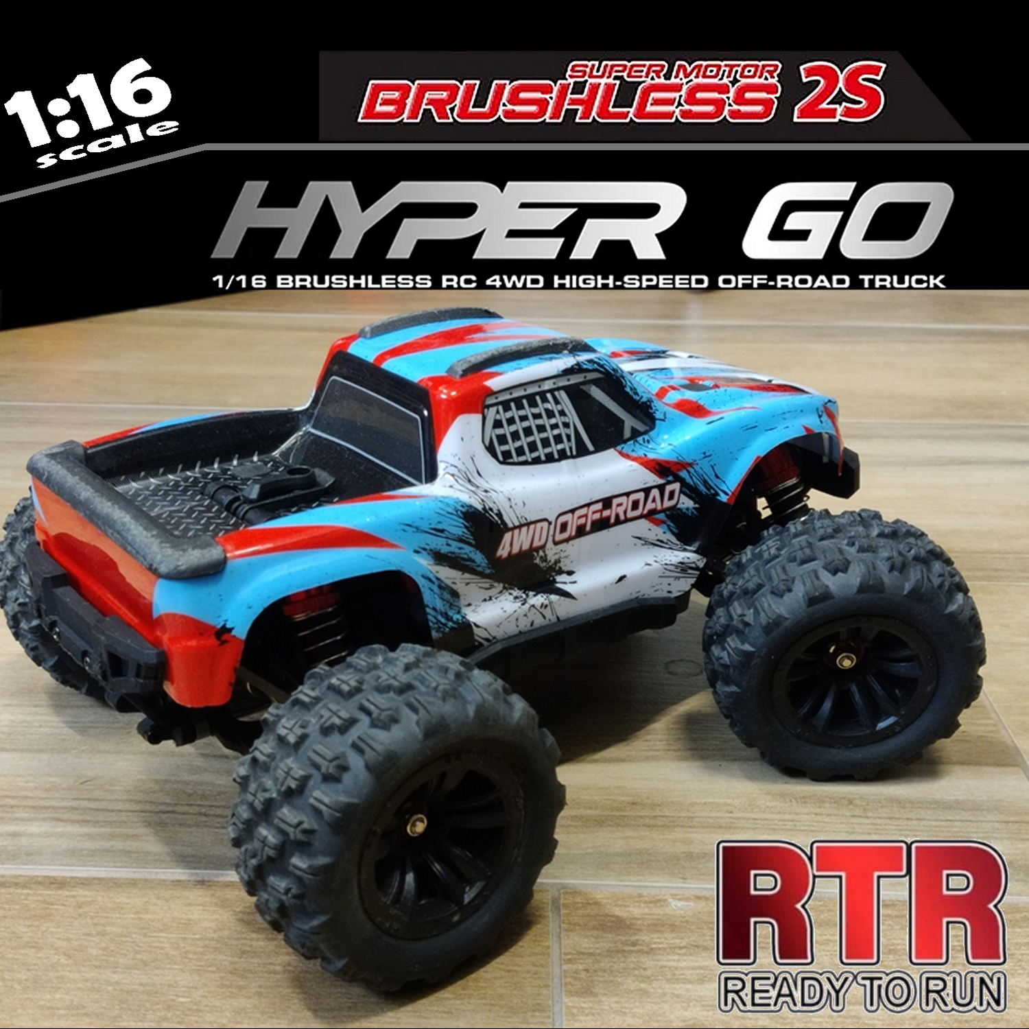 Push the throttle hard off-road and still never lose control - the Hyper Go monster truck in 1:16 scale accelerates up to 45 km/h(68kmph with 3s Lipo Battery) with its 2845 brushless racing motor and ensures precise handling with regulation options.