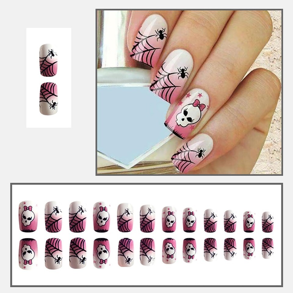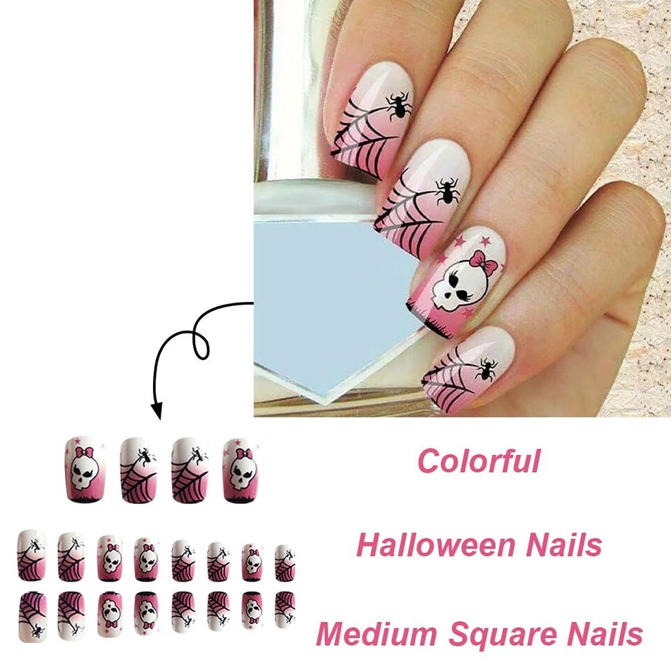 - RIICFDD Halloween Spider Web Kawaii Skull Pink Gradient Short Square Nails 24