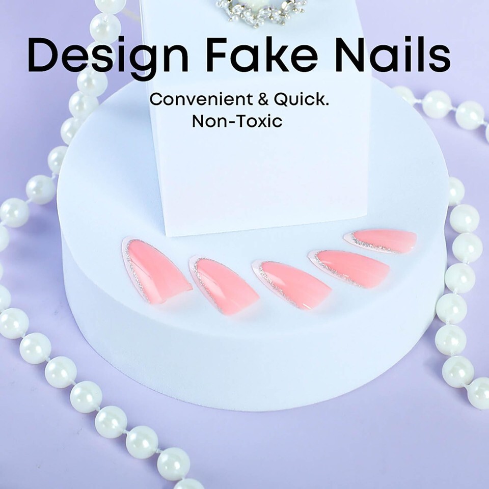 - RUOKEXIN Almond Medium Pink Press On Nails Silver Glitter White Tips 24pcs