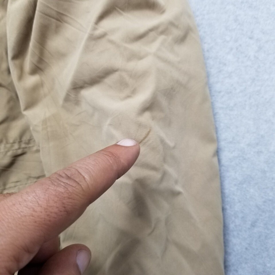 “has stains, one snap button is missing” |
