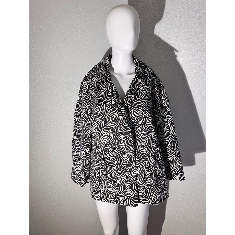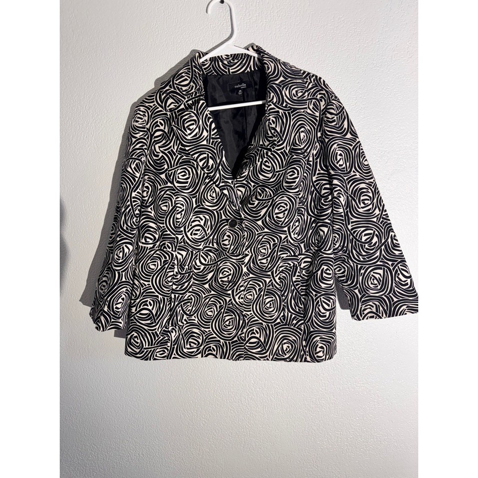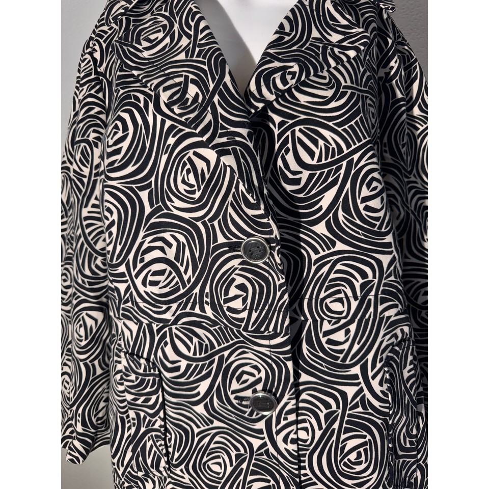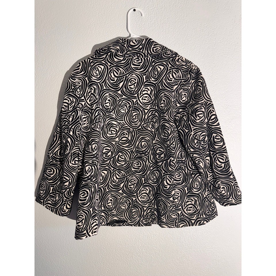 Make a bold statement in this eye-catching Rafaella Woman blazer. Featuring a mesmerizing swirl print in classic black and white, this tailored piece adds flair to any wardrobe. Crafted from a cotton-spandex blend with a full polyester lining for comfort and structure, it?s the perfect layering piece for work or casual chic.