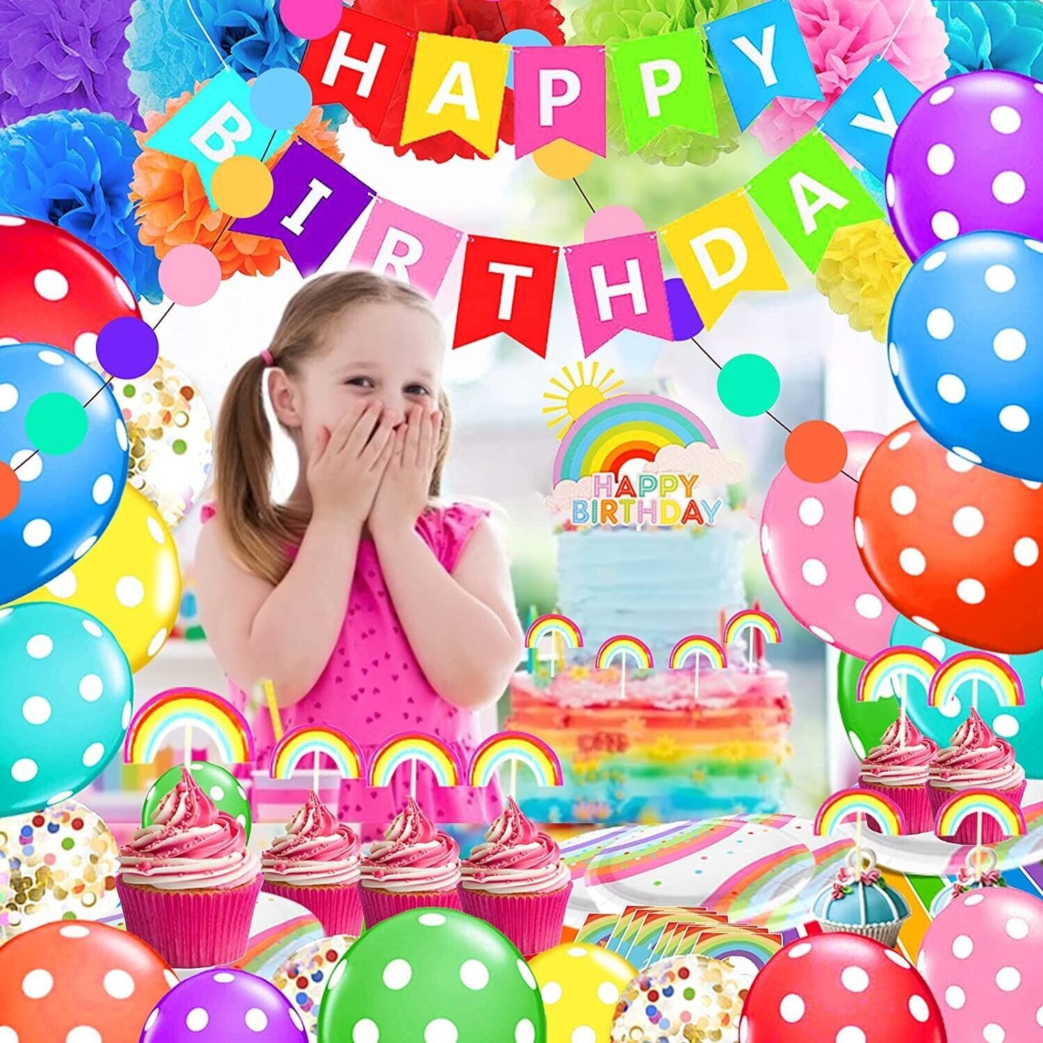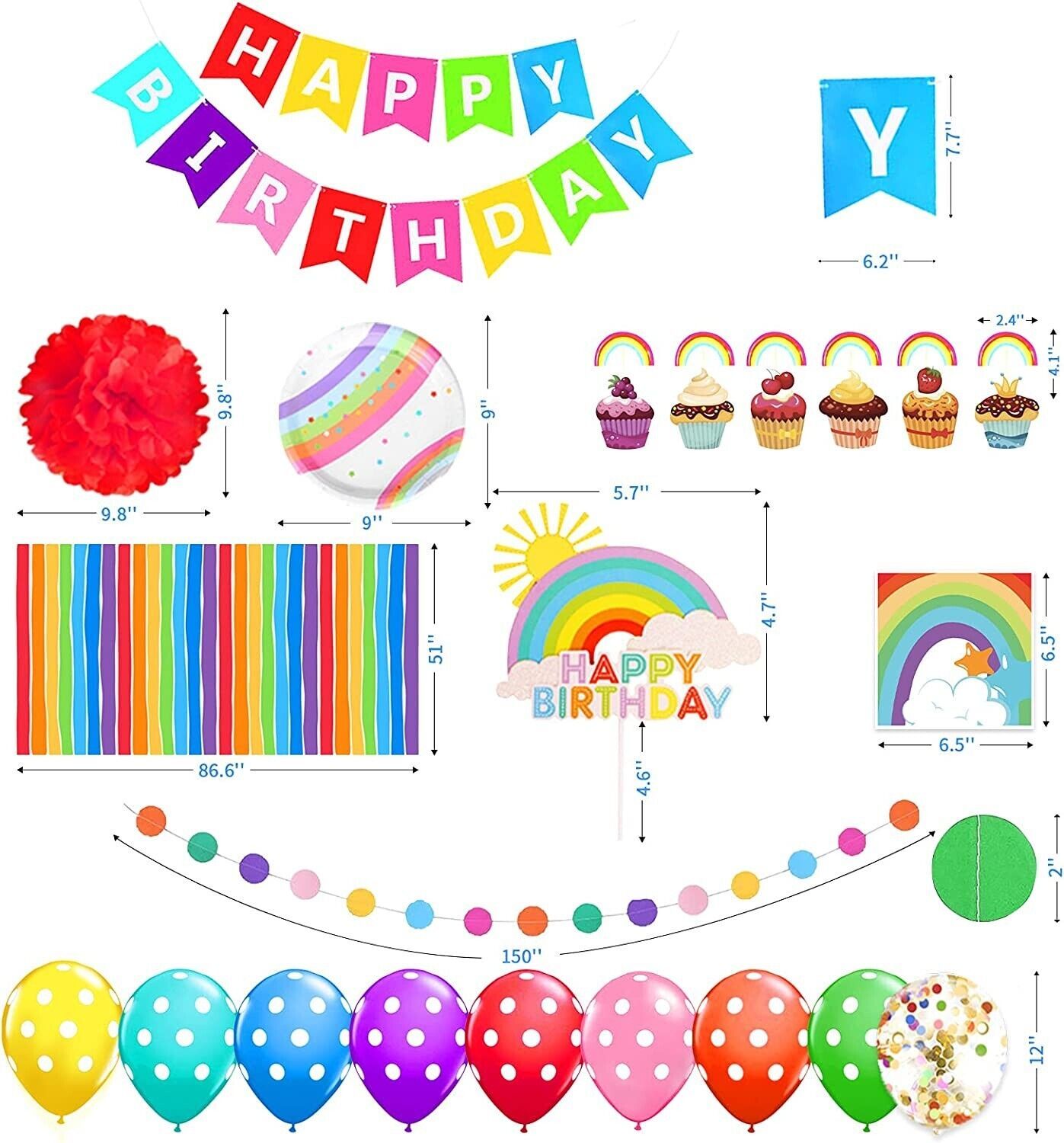 ?Premium Quality - The rainbow happy birthday banner, rainbow circle garland, pom poms, rainbow plates and napkins, cake toppers and cupcake toppers are made of high quality cardboard paper, which is no bad smells, lightweight, sturdy, no wrong spelling and well printed. All pieces are environmentally friendly, non-toxic and safe to your childs. Disposable paper save clean-up time and most of them are resuable. Save Time, Save Money.