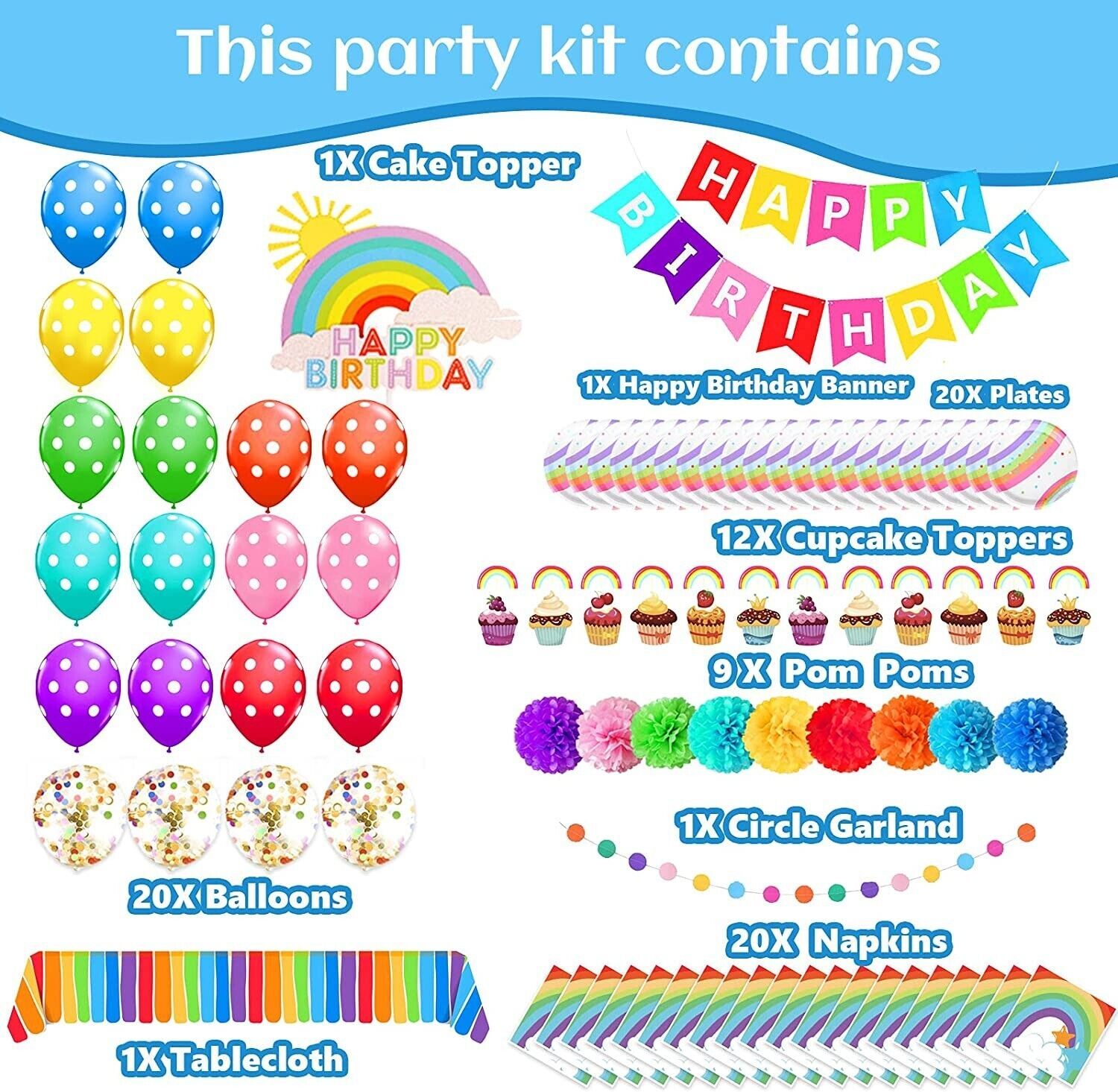 ?Perfect Rainbow Theme Party Set - The wonderful rainbow birthday decorations include 1pc rainbow birthday banner, 20pcs rainbow paper plates, 20pcs rainbow napkins, 9pcs colorful pom poms, 1pc rainbow tablecloth, 1pc rainbow cake toppers, 12pcs rainbow cupcake toppers, 1pc rainbow circle paper garland. This ideal rainbow party decor pack definitely leaves you an unforgettable memories and colorful moment with kids, friends and family in your precious lifetime.