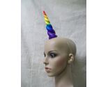 Rainbow Unicorn Costume Horn. Spiral design. Colors fade from purple-blue-green-yellow-orange-red. Has an elastic string with a toggle to adjust. Some of the horns have a different type of head string than shown in the photo, it is a flat wider clear string. Can be worn by male or female. May also fit some pets (Just be sure to do something with the toggle strings so they can't access them). Not intended for children under 14 years of age. Made of lightweight foam. There's some wrinkles all around. Approx. 6.5" tall from base.