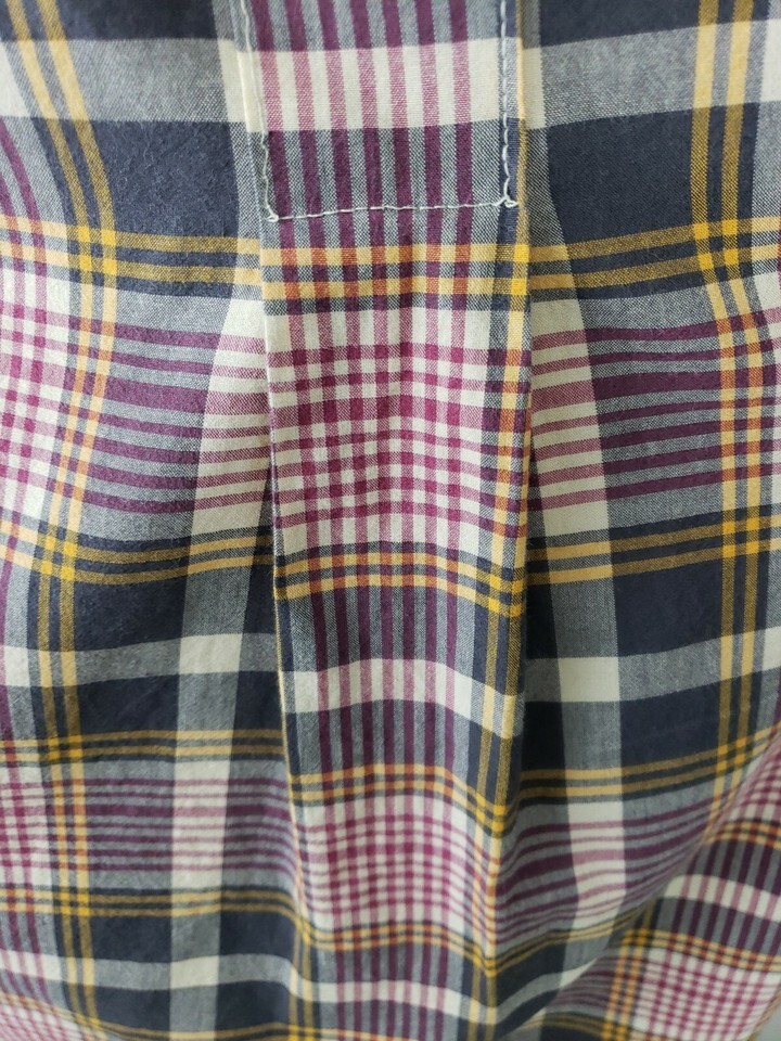 Relaxed, longer fit and a vibrant plaid pattern in neutral colors (taupe, pink, yellow/orange)