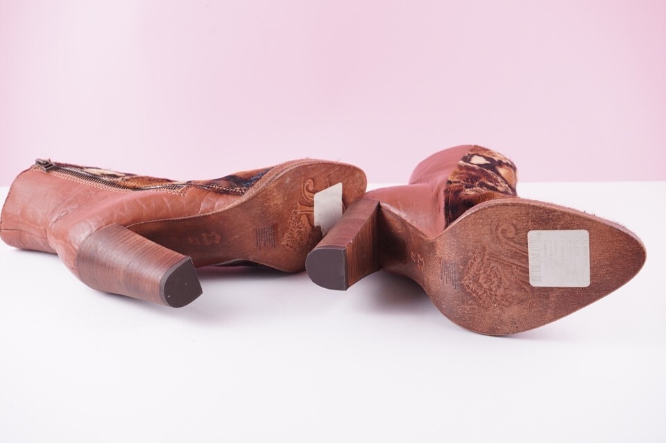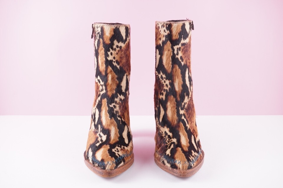- RARA FREE PEOPLE PORTUGAL BROWN LEATHER CALF HAIR LEOPARD PRINT BOOTIES Size 6
