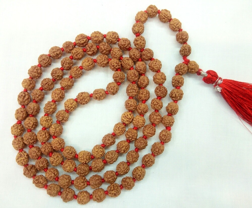 Design : 108 + 1 beads of clear , smooth , uniform chikna beads of 4 mukhi rudraksha ,design as a mala having traditional knot between each beads .