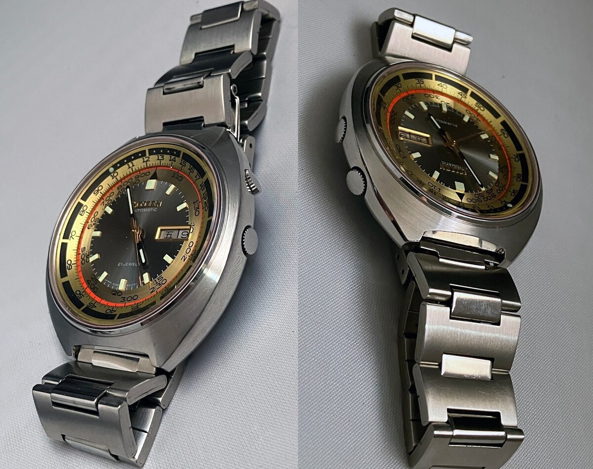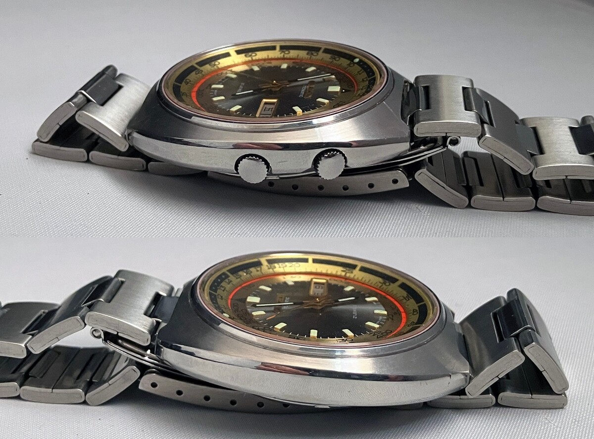 Inner rotating slide ruler bezel rotates with crown at 2 o' clock.