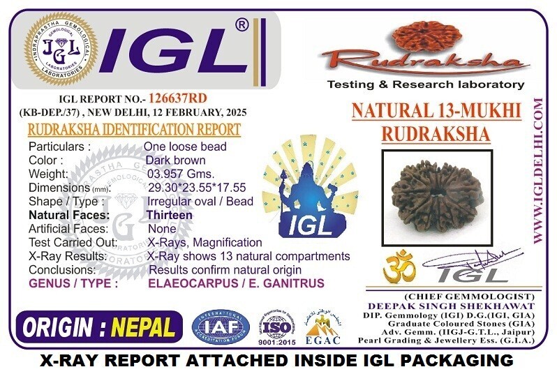This Rudraksha provides all attainments connected with chemical science. The researchers of medical science reach new horizons of success by wearing this thirteen face Rudraksha.