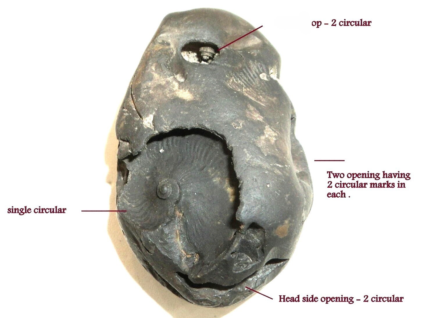 Shaligram having 4 opening 8 chakras; one top side chakra; cold to touch; lines; black color; stable seat; shanka and mace, bow and arrow signs; 4 opening ? 8 chakras with single chakra on top is known as Vishvaksena Shaligram .
