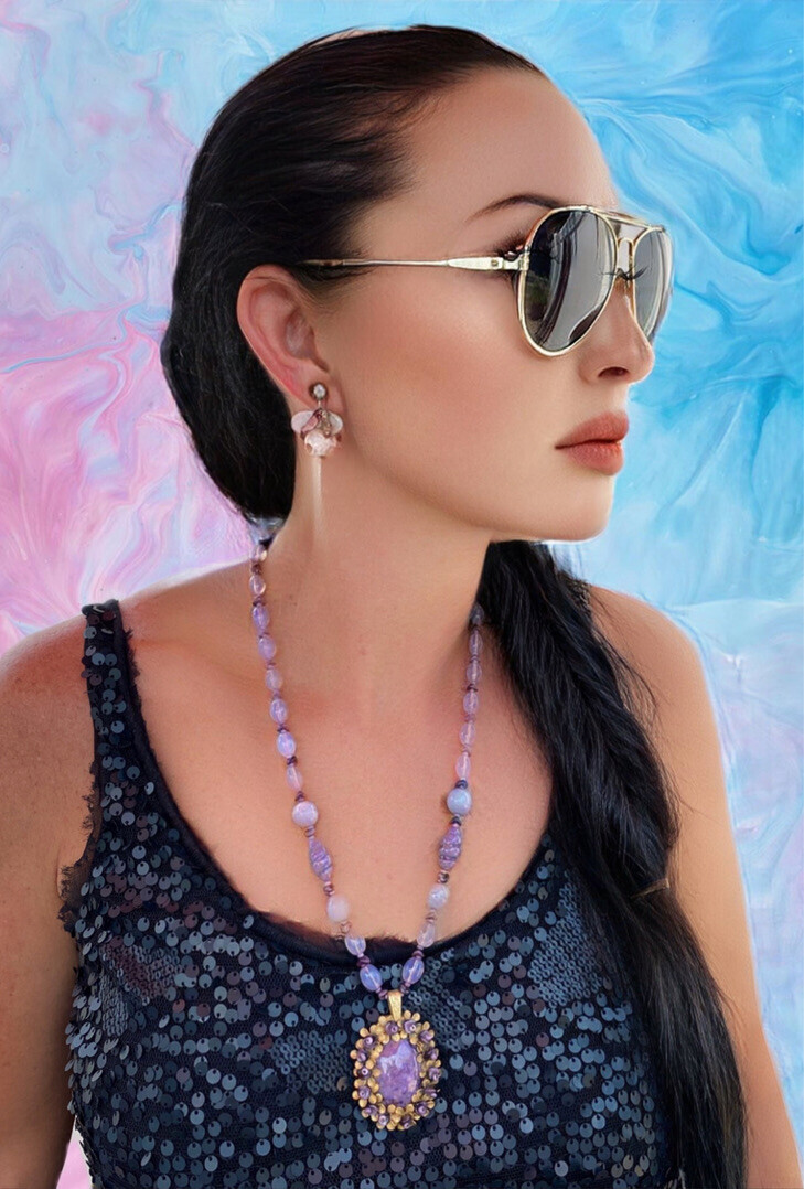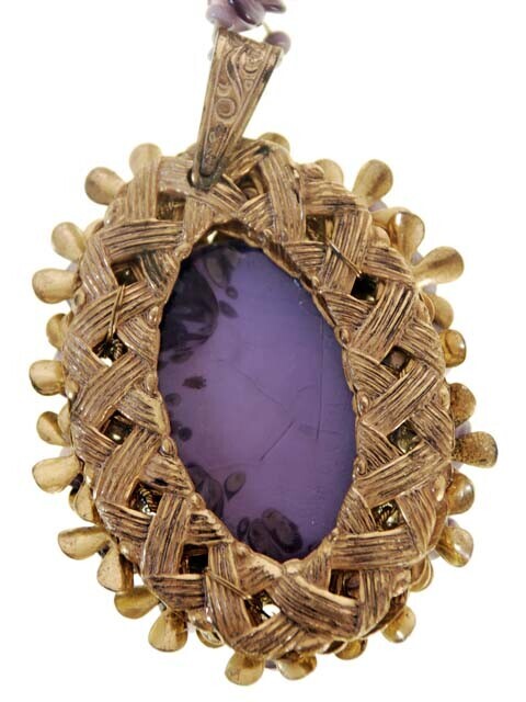 Stunning RARE vintage Miriam Haskell necklace is made up of smoky pink glass beads with dark purple glass spacers and a great classic Haskell fob with a large purple glass stone and glass beads in the brass flower centers.