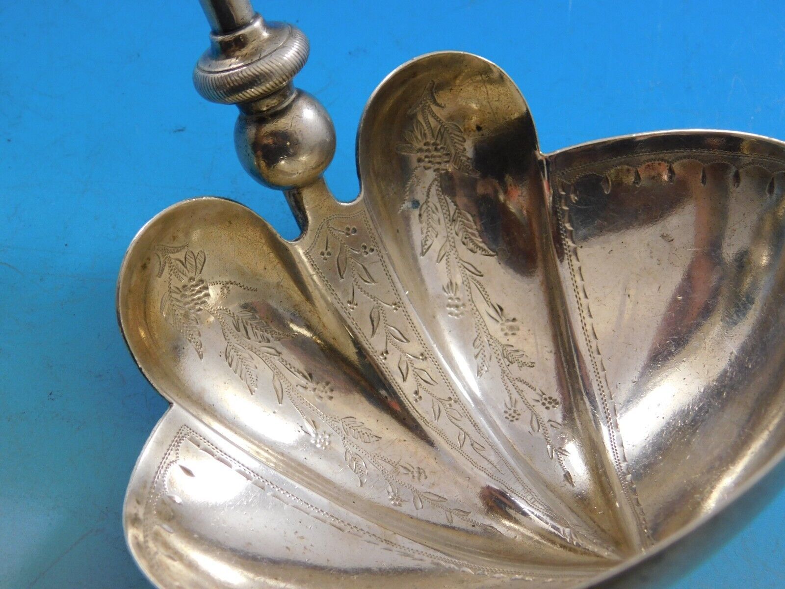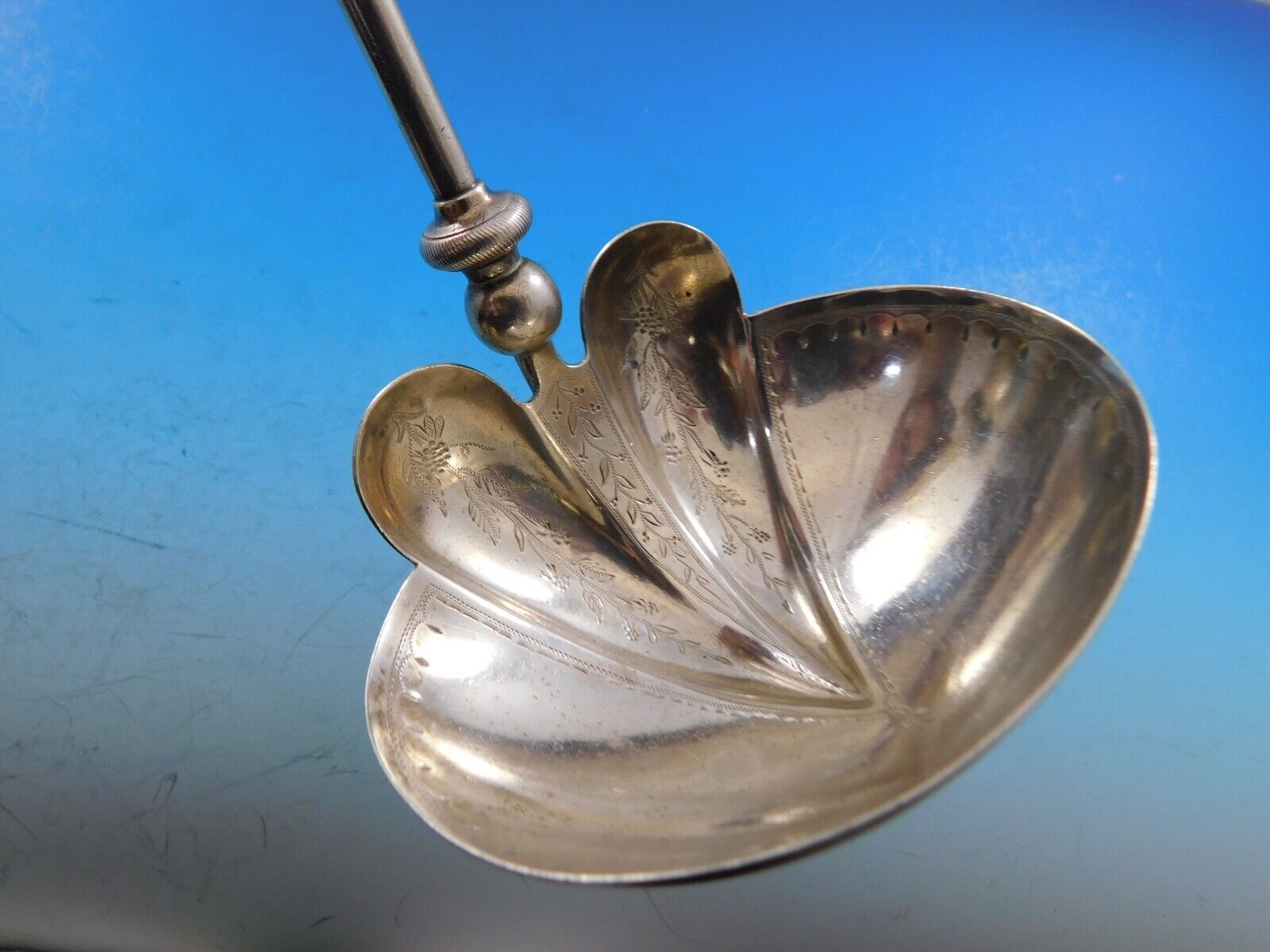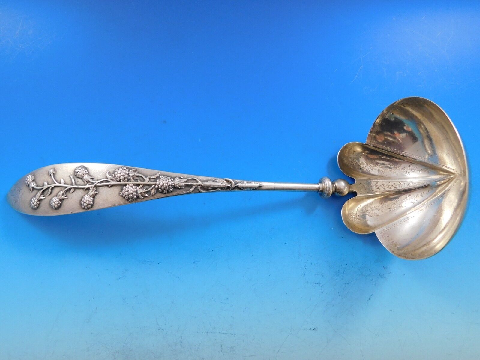 Sterling silver Oyster Ladle with applied berries and brite-cut detailing, circa 1870, 10 3/4" in the pattern Raspberry by Gorham. It is monogrammed (monos vary) and is in excellent condition.