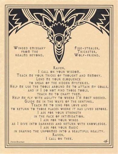 The Raven is vaunted within Native American culture as a wise trickster, whose wisdom can offer much help and whose guile can leave you puzzled. Here, we display the heartfelt prayer of Travis Bowman framed in the artwork of Eliot Alexander, intended to aid you invoking the spirit of this animal and seeking the wisdom and guile when you need it in your life. Printed on an 8.5 inch by 11 inch parchment-like paper.