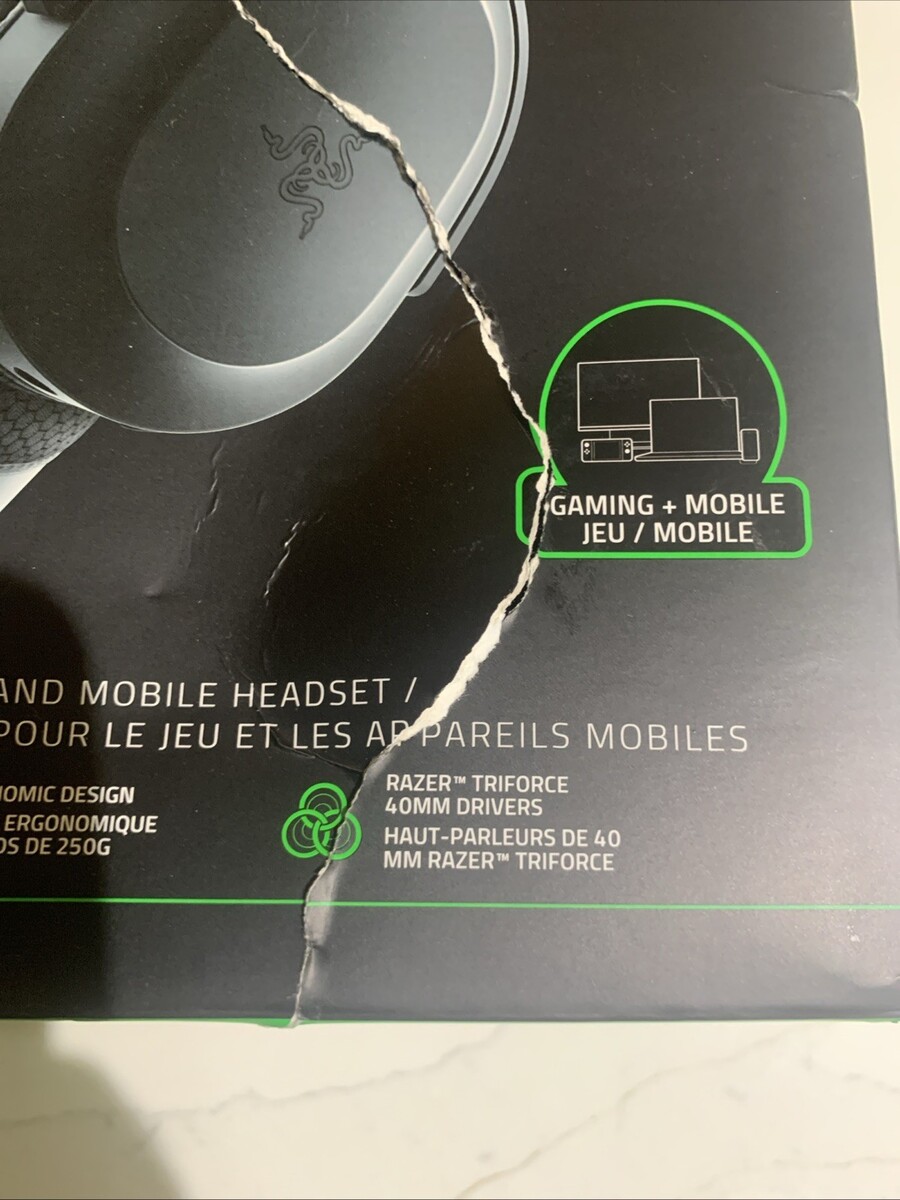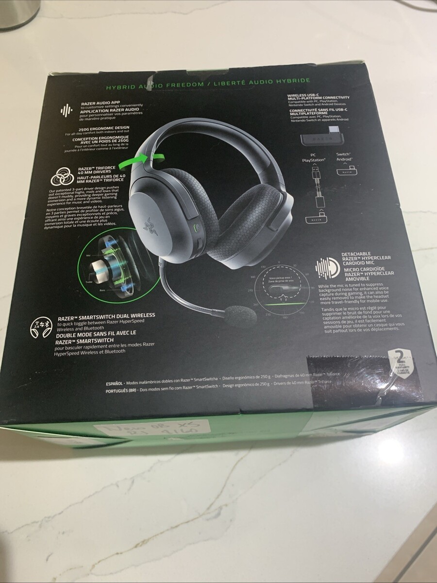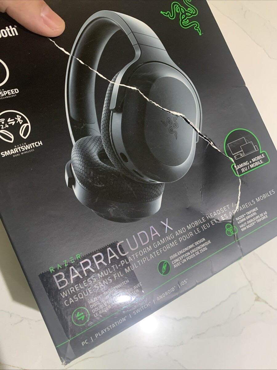 New item, but box has rips in it. Please look at photos. The Razer Barracuda X Black Wireless Multi-Platform Gaming and Mobile Headset is a high-quality headset designed for gamers and mobile users alike. With its sleek black design and adjustable headband, it offers comfortable long gaming sessions. The wireless connectivity allows for freedom of movement while the boom microphone ensures clear communication with teammates. This headset is perfect for those looking for a reliable and stylish audio option for their gaming or mobile needs.
