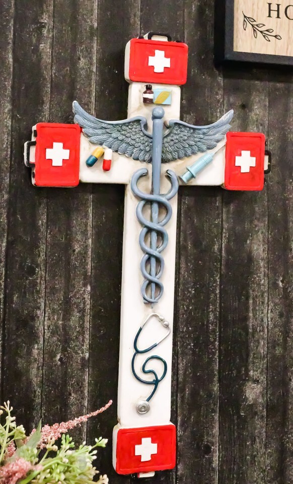 ? This hanging wall cross is the perfect addition to any home of faith. Its unique style is sure to become a welcome staple of any room. Featuring the Caduceus symbol of 2 intertwined serpents on a winged staff wand designed on the cross. Consider this item as a gift for any of your faithful friends or family, especially those in the vocation of medicine and health care!