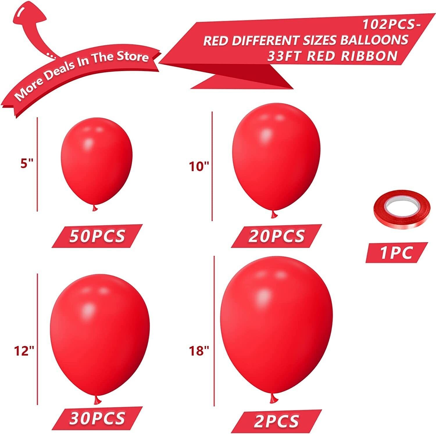 Upgraded Red Balloons: This red balloons 102PCS package is worth the money, including 2*18 inches, 30*12 inches, 20*10 inches, 50*5 inches red latex balloons, and 33ft red ribbons.