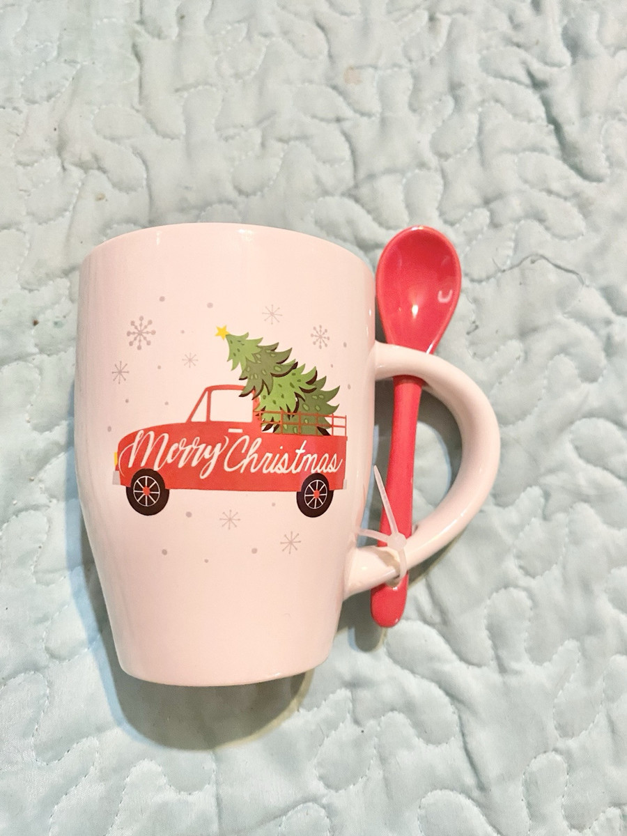 - Red Pickup Truck Merry Christmas Tree 11oz Coffee Mug w/Spoon Ceramic