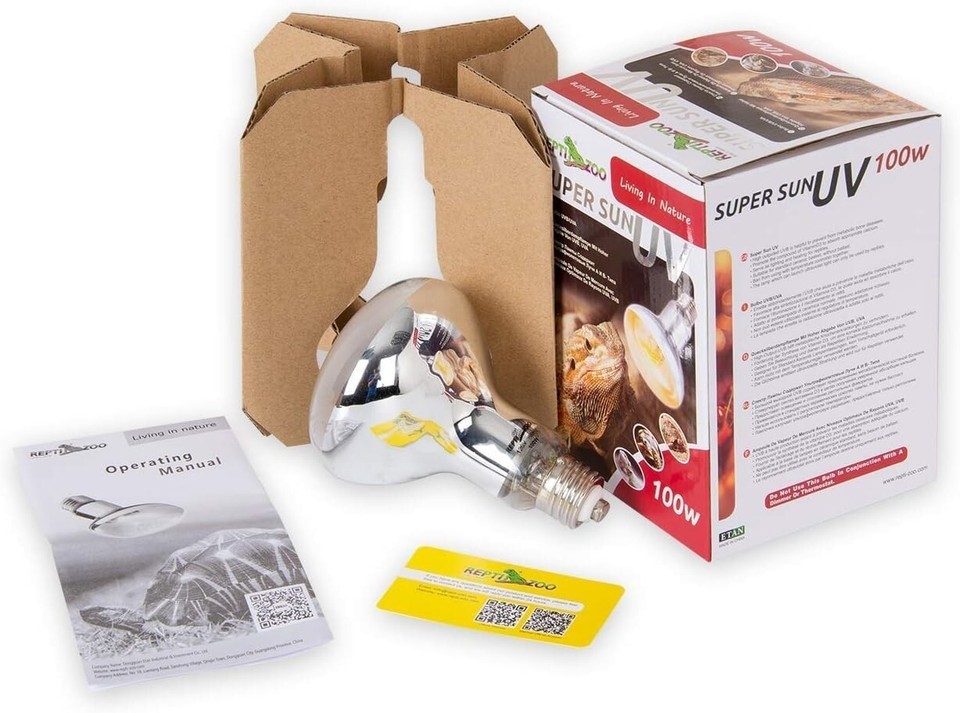 Illuminate your reptile?s habitat with the UVA + UVB Sun Basking Spot Lamp. This 100W lamp replicates natural sunlight by providing essential visible light, heat, UVA, and UVB rays?key components for your reptile?s health. UVA offers necessary warmth, while UVB supports vitamin D3 synthesis for strong bones and healthy skin. The self-ballasted design requires no external ballast and includes thermal protection against overheating, ensuring safety and ease of use. Suitable for E26 sockets, this lamp is a reliable choice to create a naturalistic environment for your pet. Package includes one REPTI ZOO Reptile UVA + UVB Sun Lamp. If you have questions, our dedicated support team is ready to assist you within 24 hours.