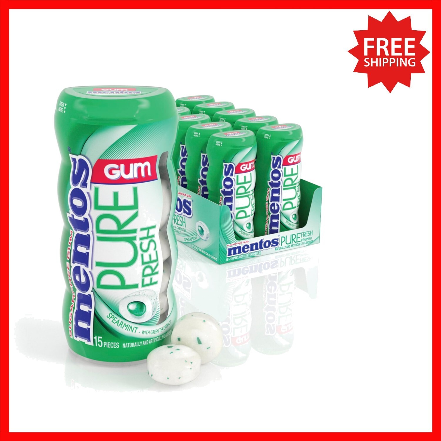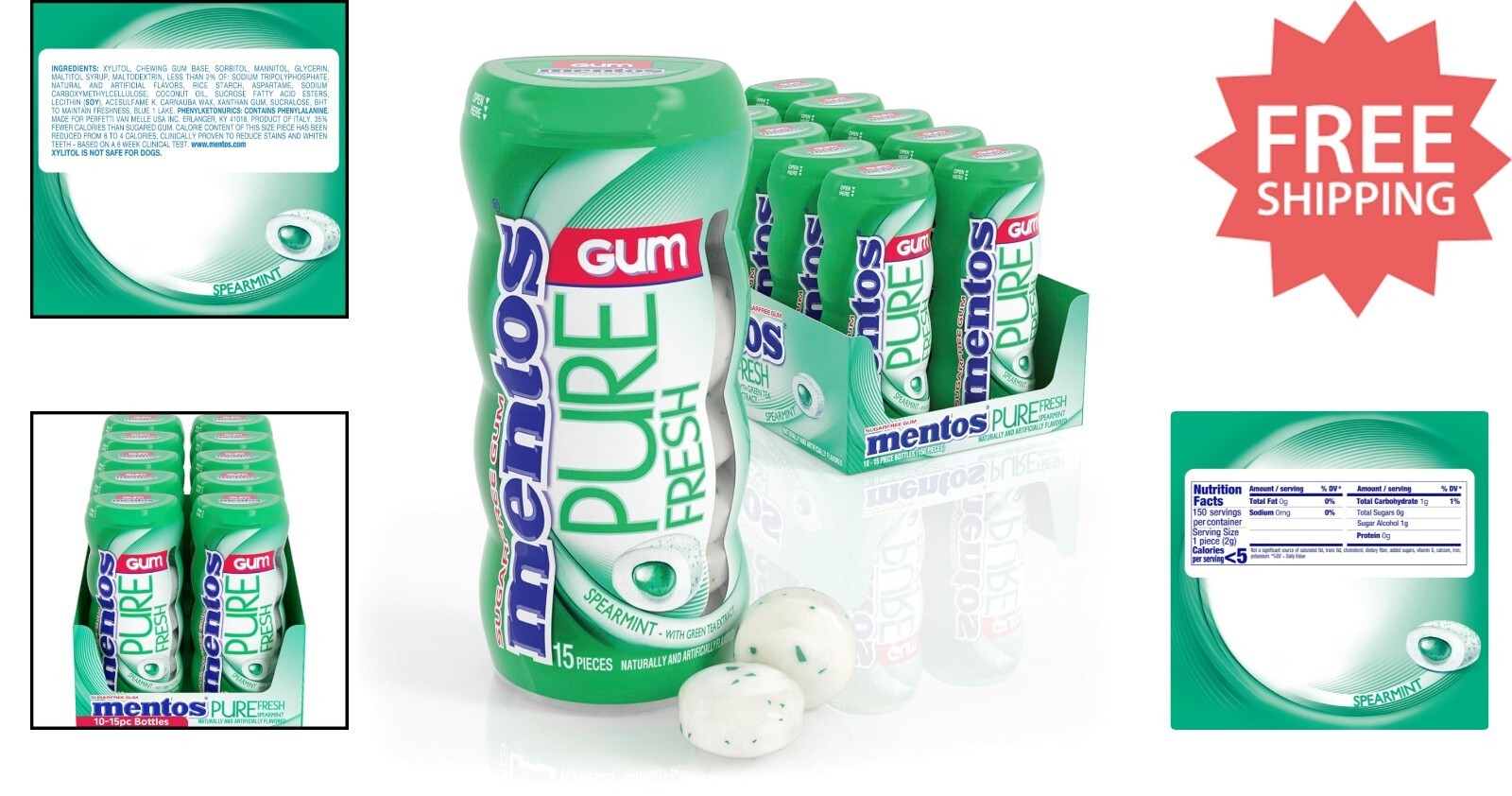 Enjoy the refreshing burst of Mentos Pure Fresh Spearmint Sugar-Free Gum with 10 convenient bottles, each containing 15 pieces. Crafted with xylitol, this gum not only delivers a crisp Spearmint flavor but also may help reduce the risk of tooth decay. The compact bottles are perfect for on-the-go freshness?tuck one into your purse, pocket, or backpack for whenever you need a quick breath of minty freshness. Elevate your day with Mentos Gum and explore a variety of mint and fruit flavors or try Mentos Clean Breath mints in Intense Peppermint and Wintergreen. Say Yes To Fresh, anytime, anywhere! To ensure fast and reliable delivery, we work with multiple fulfillment partners and suppliers. Depending on availability and location, your order may ship from different warehouses or arrive in packaging that varies from item to item. Tracking details are typically provided shortly after shipment, and customer satisfaction remains our top priority. Please note that due to carrier policies and regional regulations, certain items may not be eligible for delivery to specific states or territories.