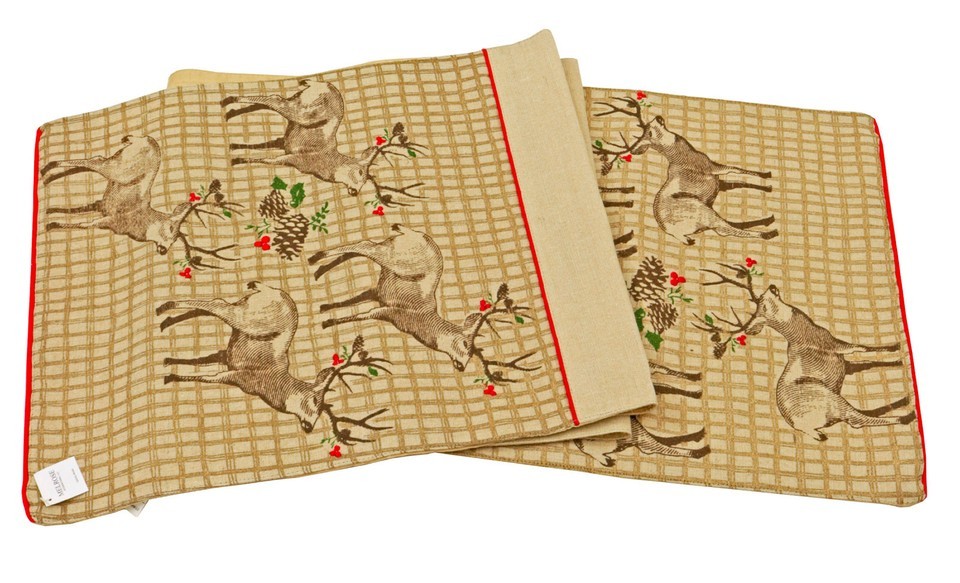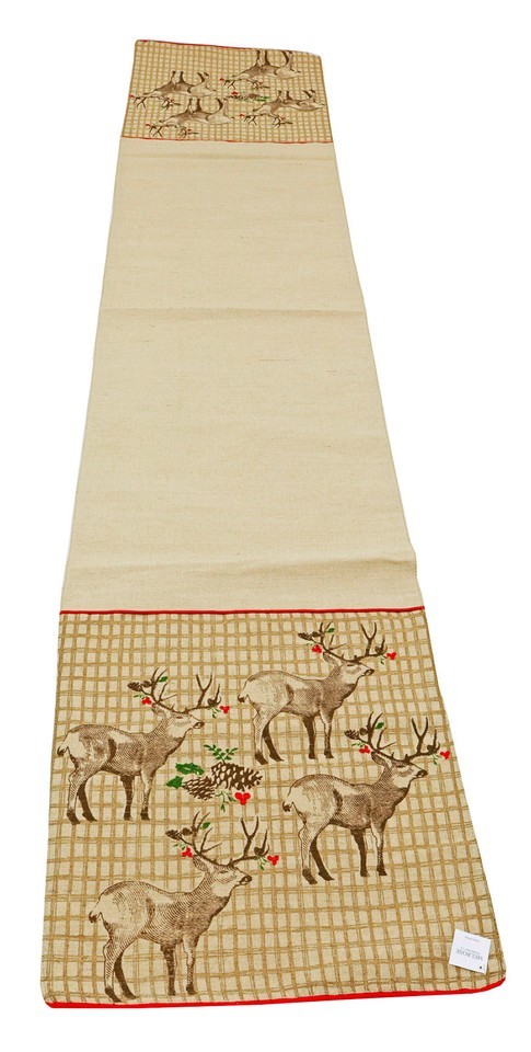 table runner has festive reindeer at both ends, The reindeer's antlers