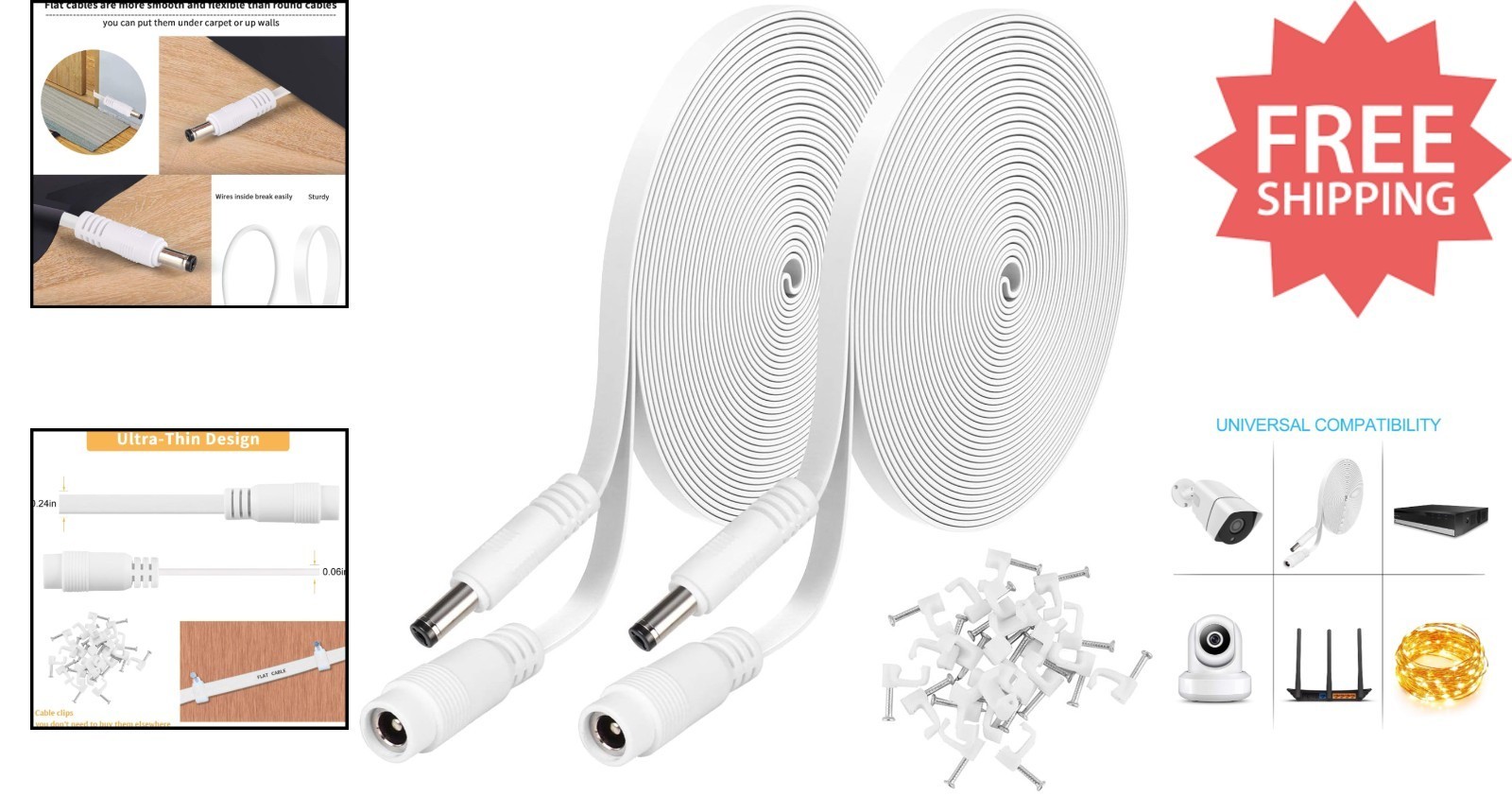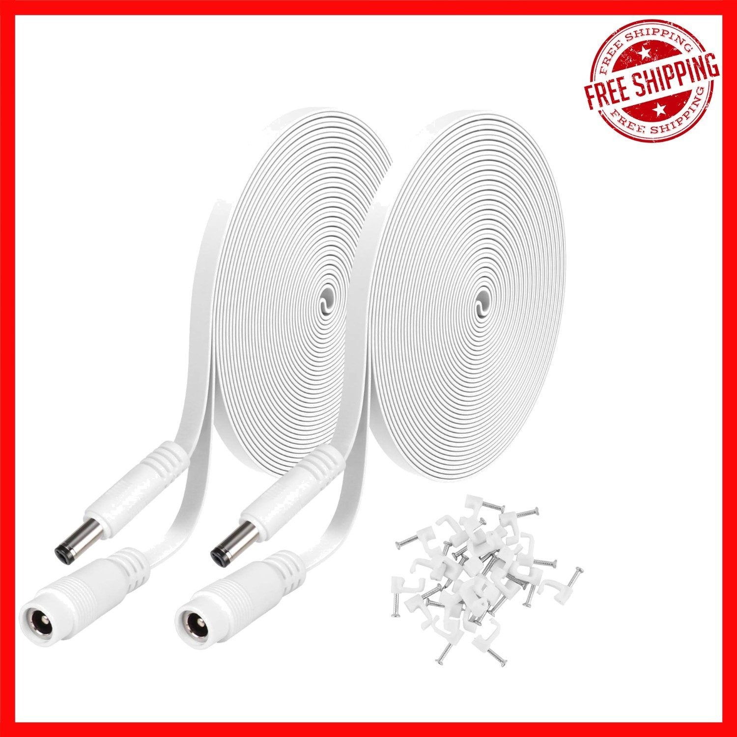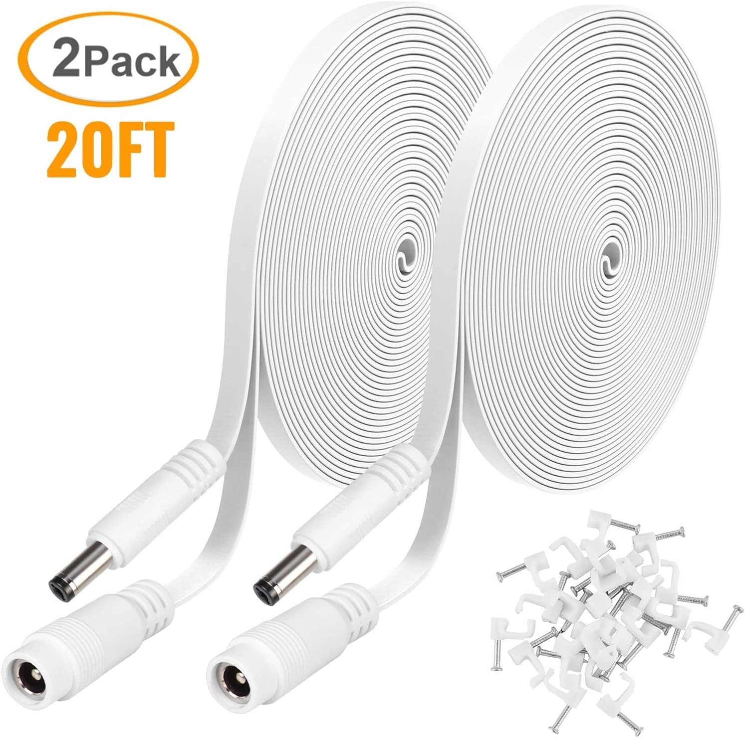 Extend your security system effortlessly with our 20 ft/6.1 m extension power cable, designed to keep your indoor or outdoor Wireless Security Camera connected over greater distances. Featuring compatible 2.1mm x 5.5mm connectors?female port and male barrel plug?it's perfect for expanding your setup with any brand or CCTV security camera using the specified connector size. The flat cable design allows easy routing through small cracks, eliminating the need for drilling. Each package includes two 20 ft extension cables and 24 wire clips for secure installation.