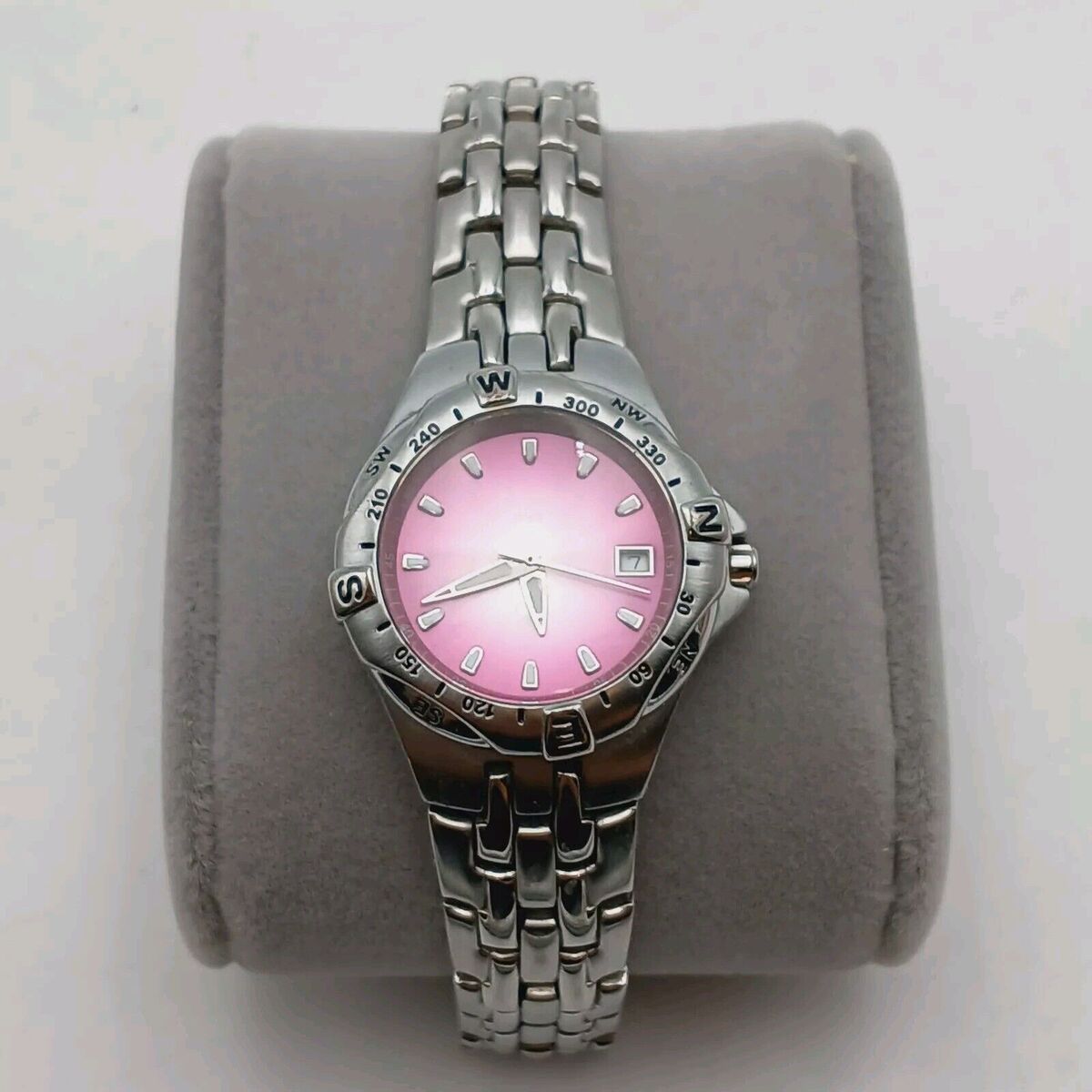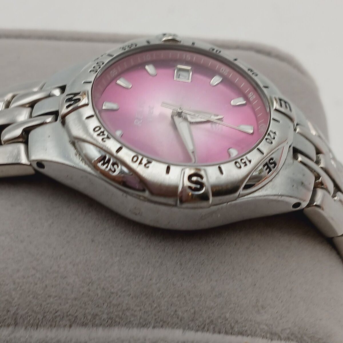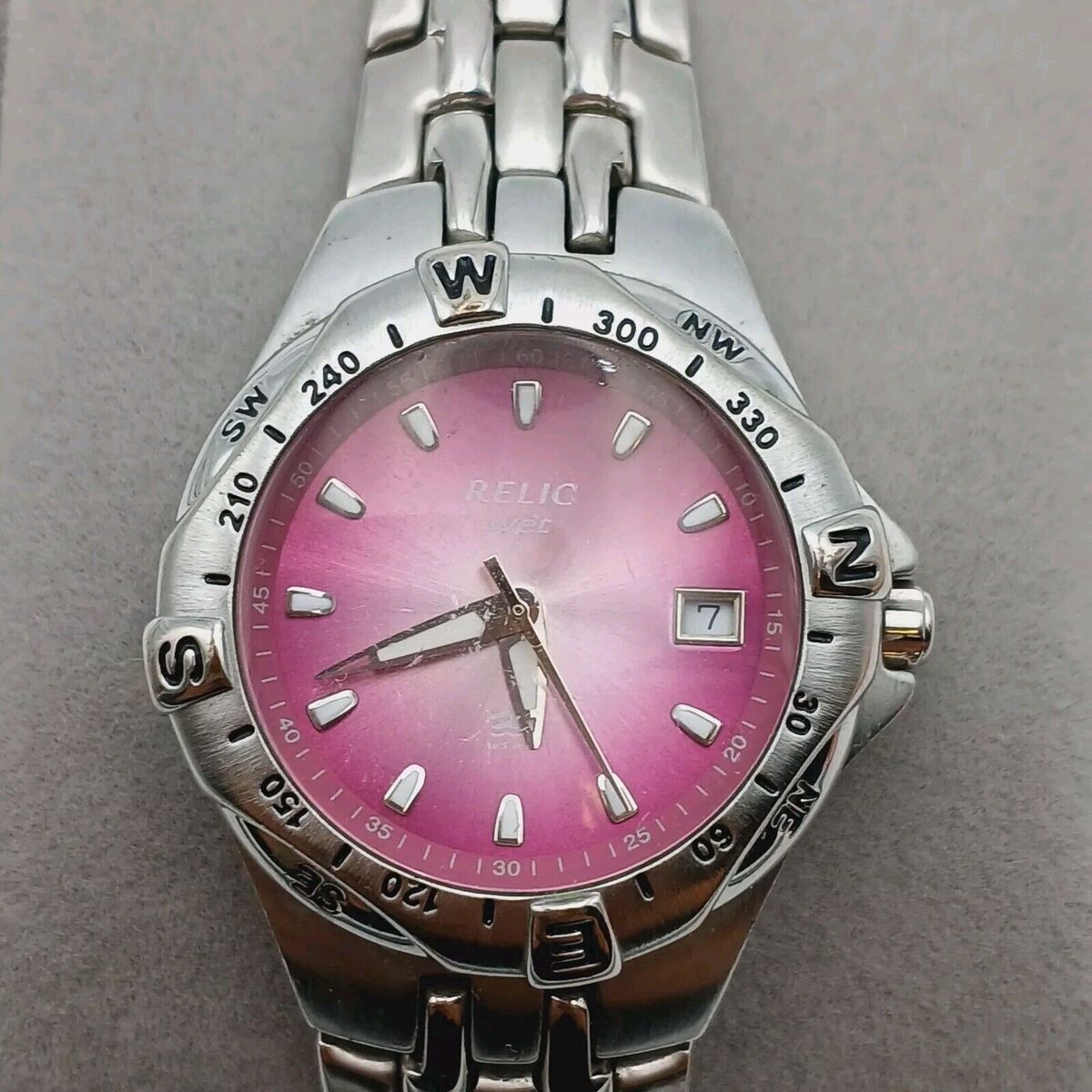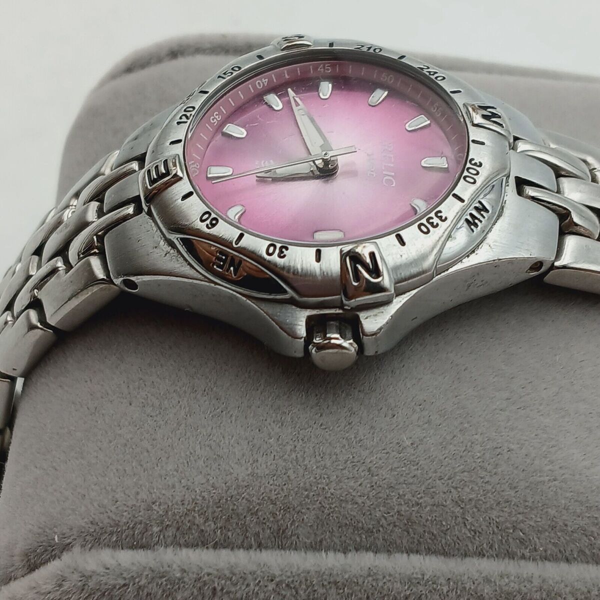 This Relic Wet Dial Ladies Date Watch is a stunning accessory for any casual outfit. The watch features a beautiful lavender dial color and a stainless steel case and band color. The bezel color is also SS, and the movement is powered by a quartz battery.