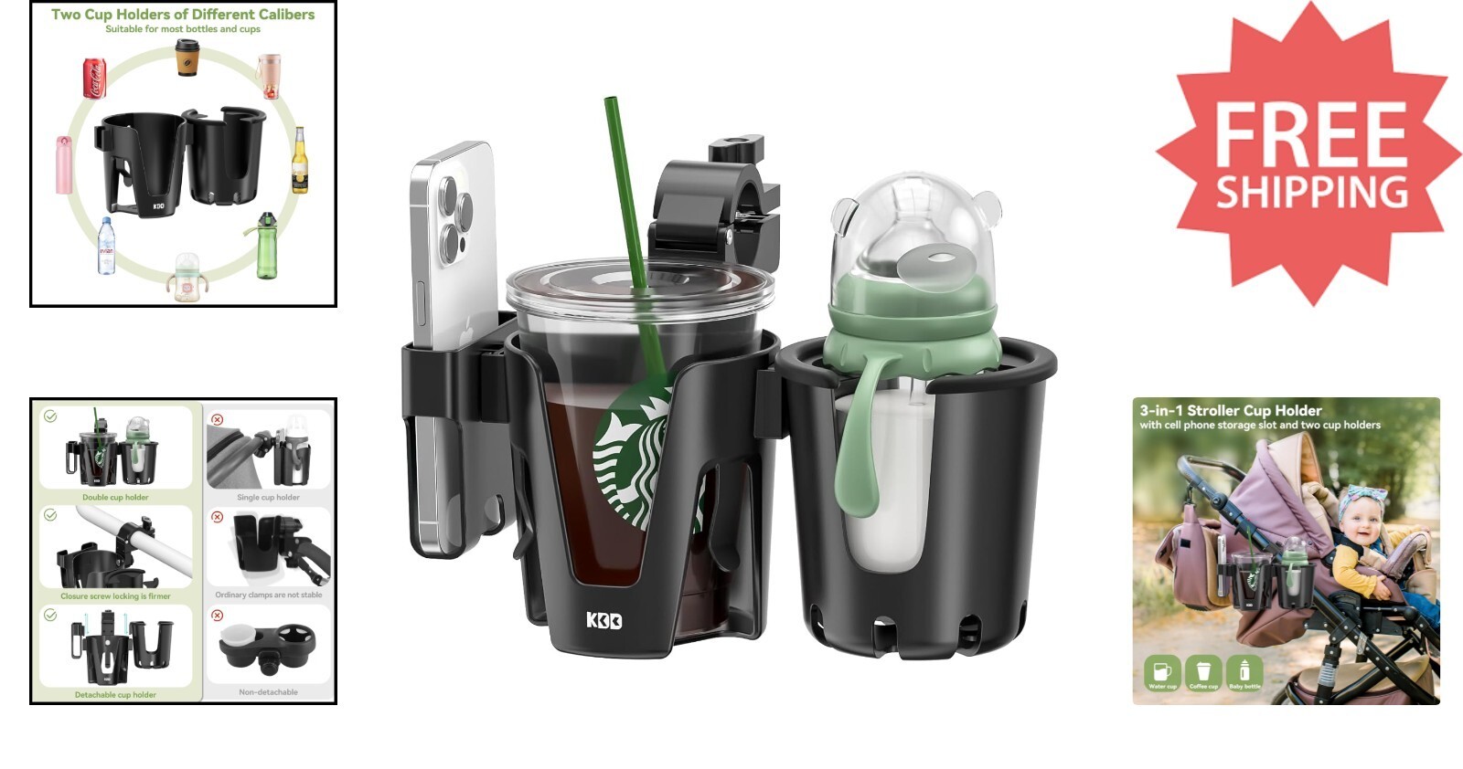Experience ultimate convenience with our 3-in-1 Stroller Cup Holder, featuring two separate cup holders and a phone organizer. The removable bottle holder accommodates various bottles and mugs, keeping your essentials within easy while you stroll. Its versatile design fits most baby carriages, bicycles, scooters, and more, with adjustments for different handlebar sizes. Crafted with soft silicone to secure drinks and equipped with anti-slip clamps for stability, this accessory ensures mess-free outings. The universal compatibility and 360-degree rotation make it a must-have for busy parents on the go.