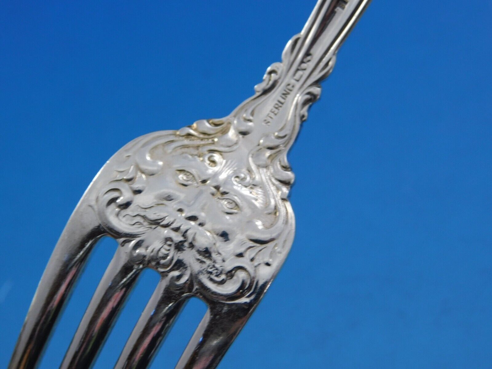 Exquisite figural Renaissance by Dominick and Haff flatware set, 168 pieces. The Renaissance pattern was patented in 1894. The handle front and the back at the base of the handle are decorated with scroll designs and a classic bearded man's face symbolizing Old Man Winter, the North Wind, or in Greek mythology, Boreas - the god of cold weather. T