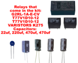 Relays that come in the kit: G2RL-1A-E-CV, T77V1D10-12, T77V1D10-12, Varistor K275 Capacitors: 22uf, 220uf, 470uf 470uf