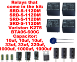Relays that come in the kit: SRD-S-112DM, SRD-S-112DM, SRD-S-112DM, SRD-S-112DM, VARISTORS K275 Capacitors: 10uf, 10uf, 10uf, 33uf, 33uf, 220uf, 1000uf, 1000uf 1000uf