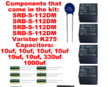 Components that come in the kit: SRD-S-112DM, SRD-S-112DM, SRD-S-112DM, SRD-S-112DM, Varistor K275 and Capacitors: 10uf, 10uf, 10uf, 10uf, 10uf, 10uf, 330uf, and 1000uf
