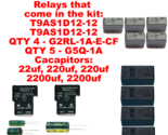Components that come in the kit: QTY 2 T9AS1D12-12 QTY 4 G2RL-1A-E-CF, QTY 5 G5Q-1A, Capacitors: 22uf, 220uf, 220uf, 2200uf, 2200uf