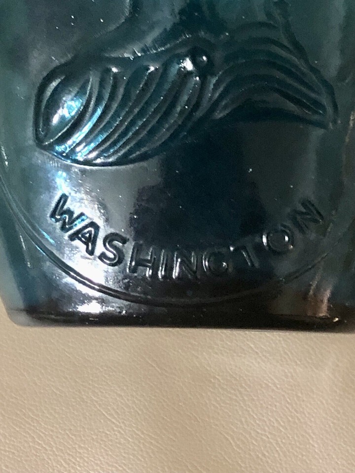 This replica of a vintage historical Washington flask is a beautiful 8-inch piece with a medium to deep blue-green teal color. Perfect for collectors of bottles and flasks, this unique piece celebrates the legacy of our country's first president. A true piece of American history, this flask would make a unique addition to any collection or display.