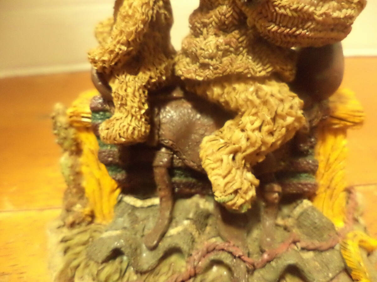This resin bear figurine is sitting on top of a saddle on top of a saw bench, making it a unique and charming addition to any room. Standing at 5 inches tall, this multicolored figurine features a bear as its subject, perfect for animal lovers and collectors. Manufactured in the 1990s, this original piece from the Animals collection is great for all occasions and would make a great display without the need for additional packaging.