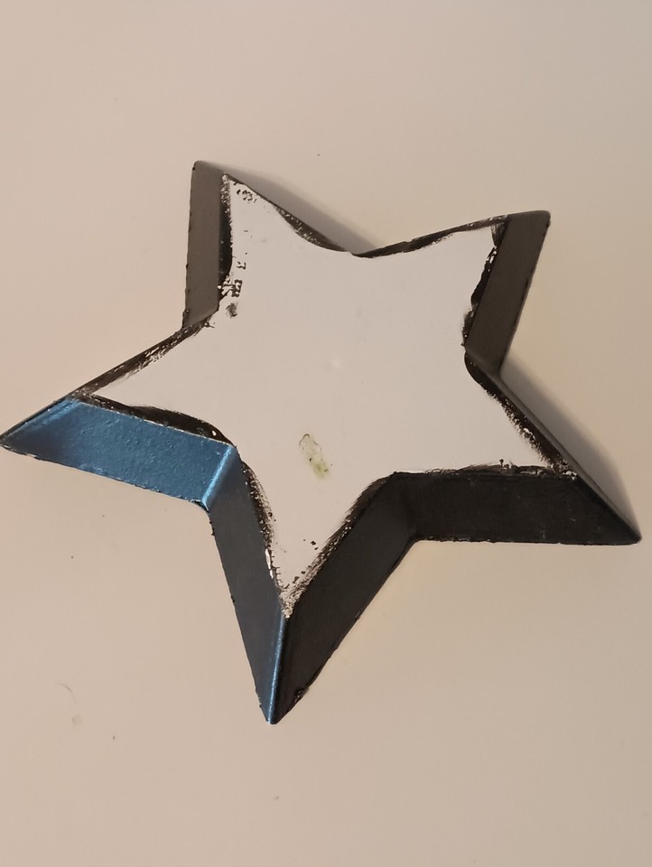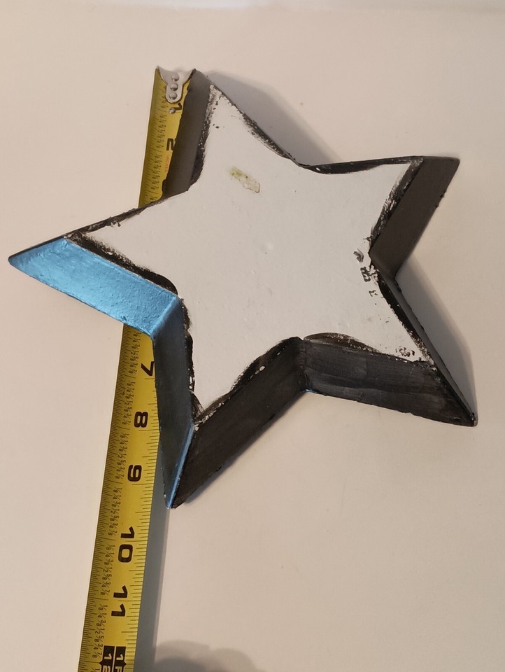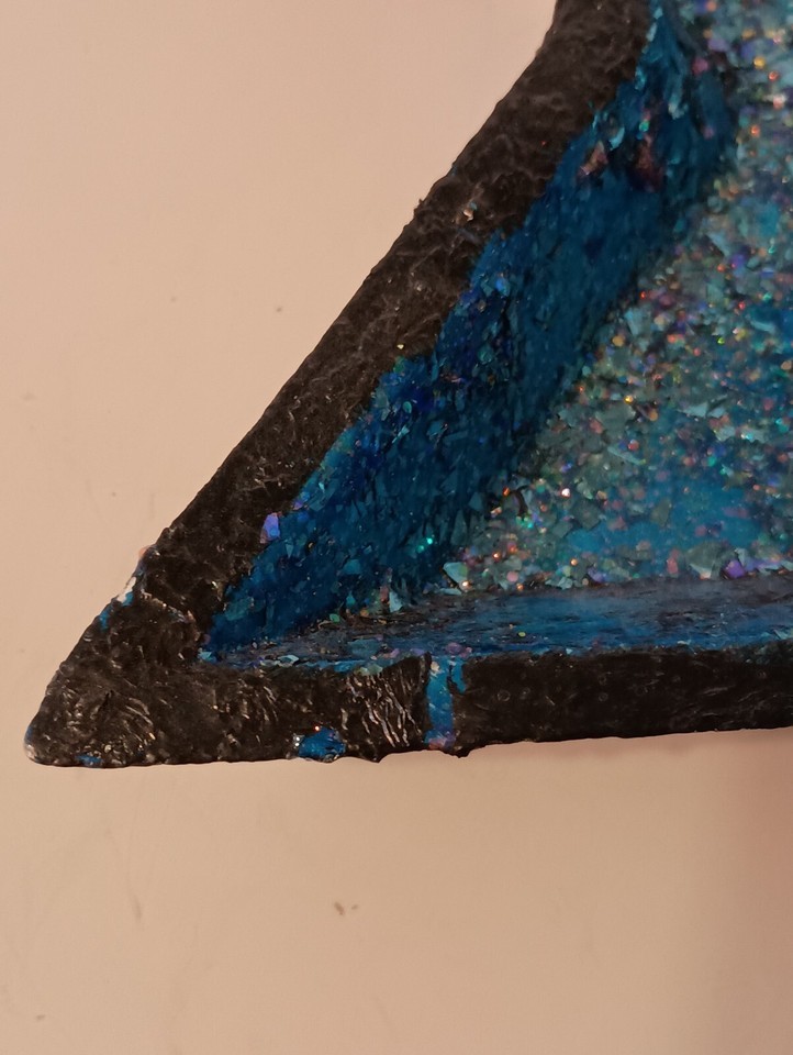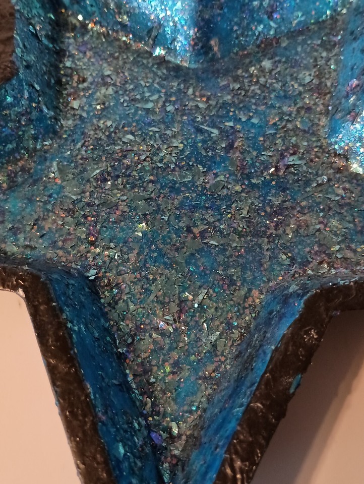 This is a unique medium-sized trinket tray in the shape of a star, crafted in a folk art style. Made from resin and plastic, it features a captivating blue and glitter with a black trim finish that adds a touch of sparkle. The design includes five points, making it a distinctive and eye-catching piece for displaying jewelry or small items. The tray is themed around stars, adding a whimsical and artful element to any space. Normal wear.
