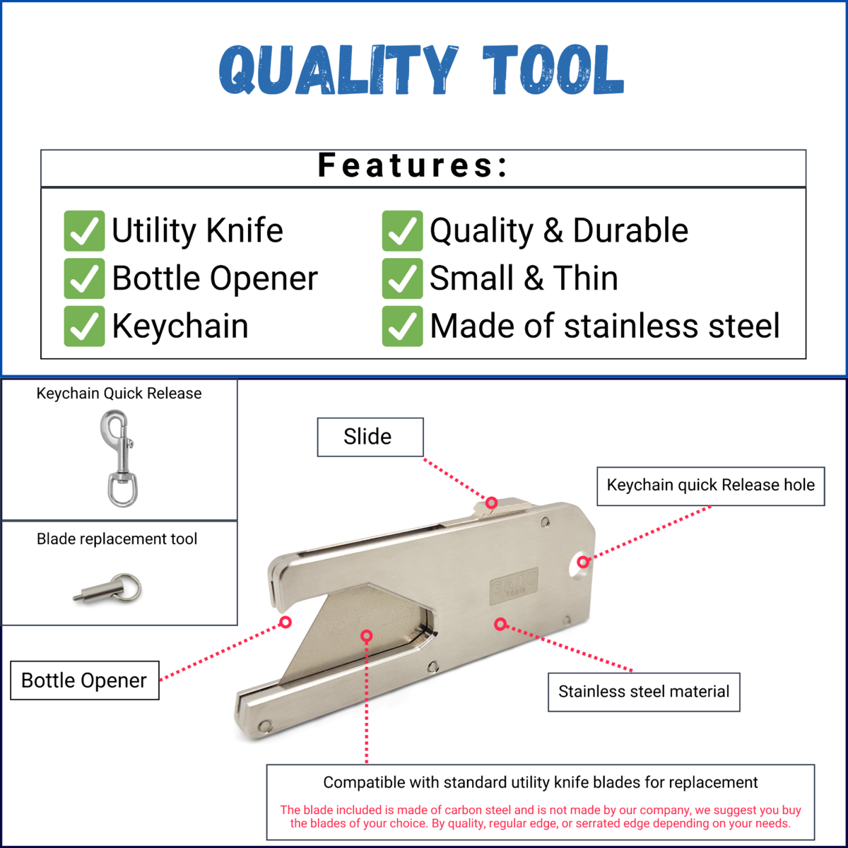 Minimalist pocket tool designed with a bottle opener and it can be used as a keychain, everyday carry mini tool. super handy, compact and very durable. open Boxes, bags next time and you don't have to open them with whatever you find. One-Handed operation, Removable blade. Compatible with Standard Utility Knife Blades.
