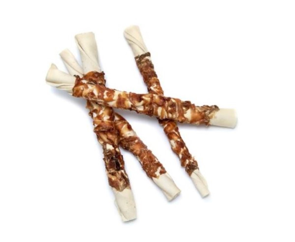Twisted texture helps to reduce plaque and tartar Pack of 12 Delicious chicken wrapping that dogs will love Rawhide texture for a chewier treat