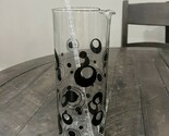 This product is a retro-style martini pitcher made of glass, with a black circle pattern and polka dot theme. It comes with a stir stick and is perfect for serving drinks at home or in a bar setting.