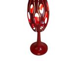 Add a bold retro accent to your space with this eye-catching red metal cutout table lamp, standing approximately 19.5? tall with a 7.5? base. The sculptural shade features striking oval cutouts that cast patterned light. This lamp is fully functional with a standard plug-in cord and inline toggle switch.
