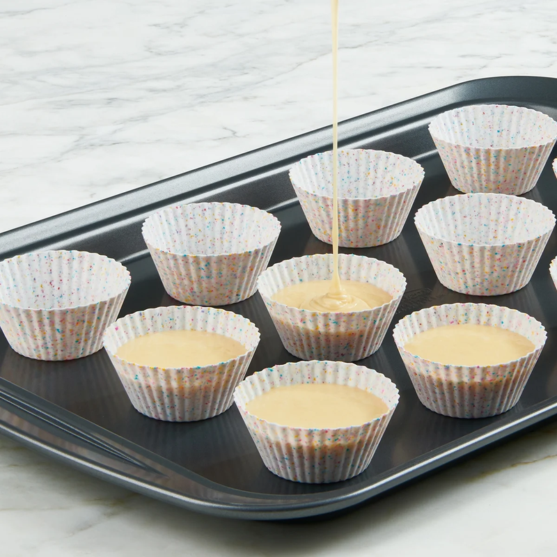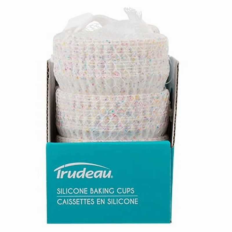 These Trudeau Silicone 12 count Confetti Muffin Baking Cups are so easy to use, all you need to do is butter or grease it, bake it, and pop it out! The Multi-color confetti cups are constructed of silicone which offers great non-stick properties for an easy release and perfect browning every time. No more paper cups! The Trudeau Silicone Muffin Cups will fit perfectly in any standard muffin pan and are reusable over and over - just place them in the dishwasher once done. The flexible easy release will allow you to bake the best muffins or cupcakes without breaking them. These practical baking cups are oven safe up to 428, microwave safe and freezer safe. Once you're done, it's so easy to clean, just pop it in the dishwasher! Perfect for muffins, make-a-head portioned smoothies, chocolate cups, organizing snacks in a bento box and more.