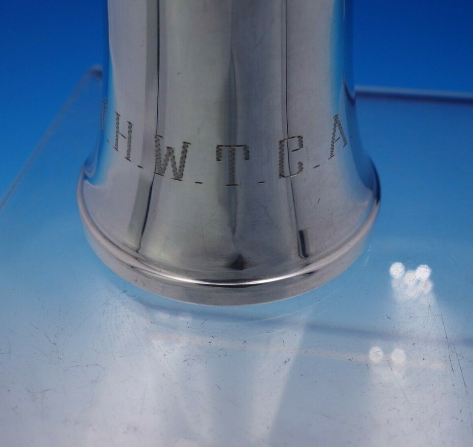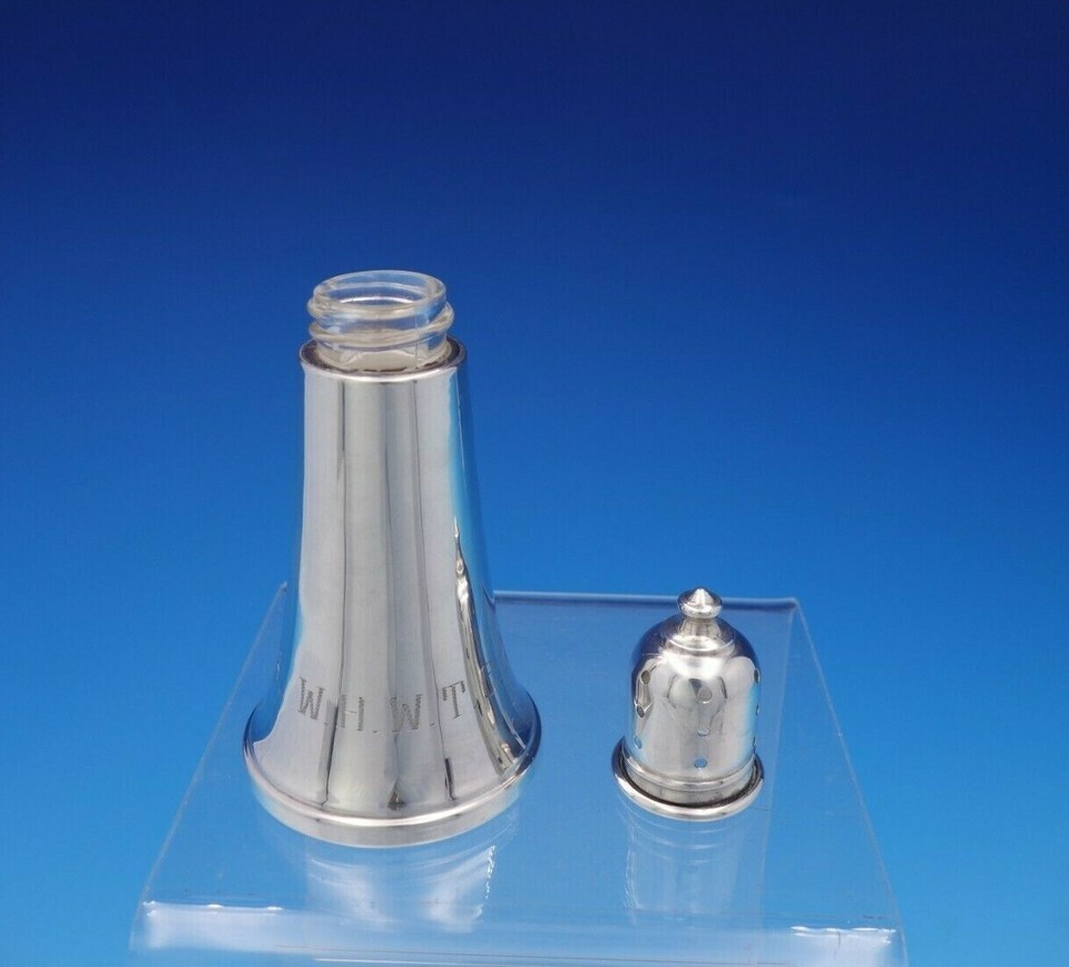 Exceptional Revere Silversmiths Inc sterling silver and glass pair of salt and pepper shakers marked #808. The shakers measures 4" tall x 1 7/8" in diameter and are weighted. The pepper has a vintage monogram (see photos; salt has no monogram) and the pieces are in excellent condition. Superb!