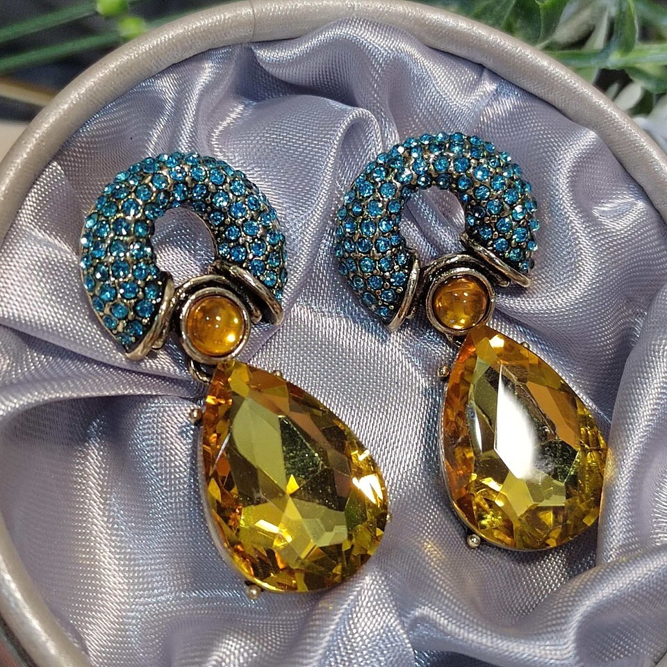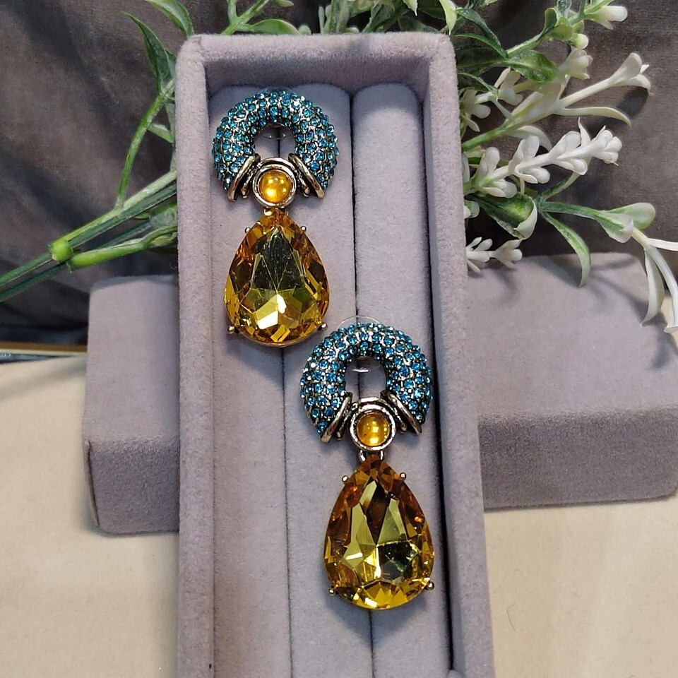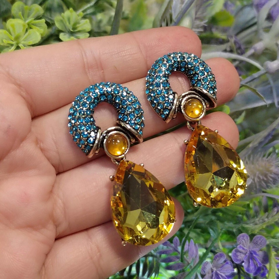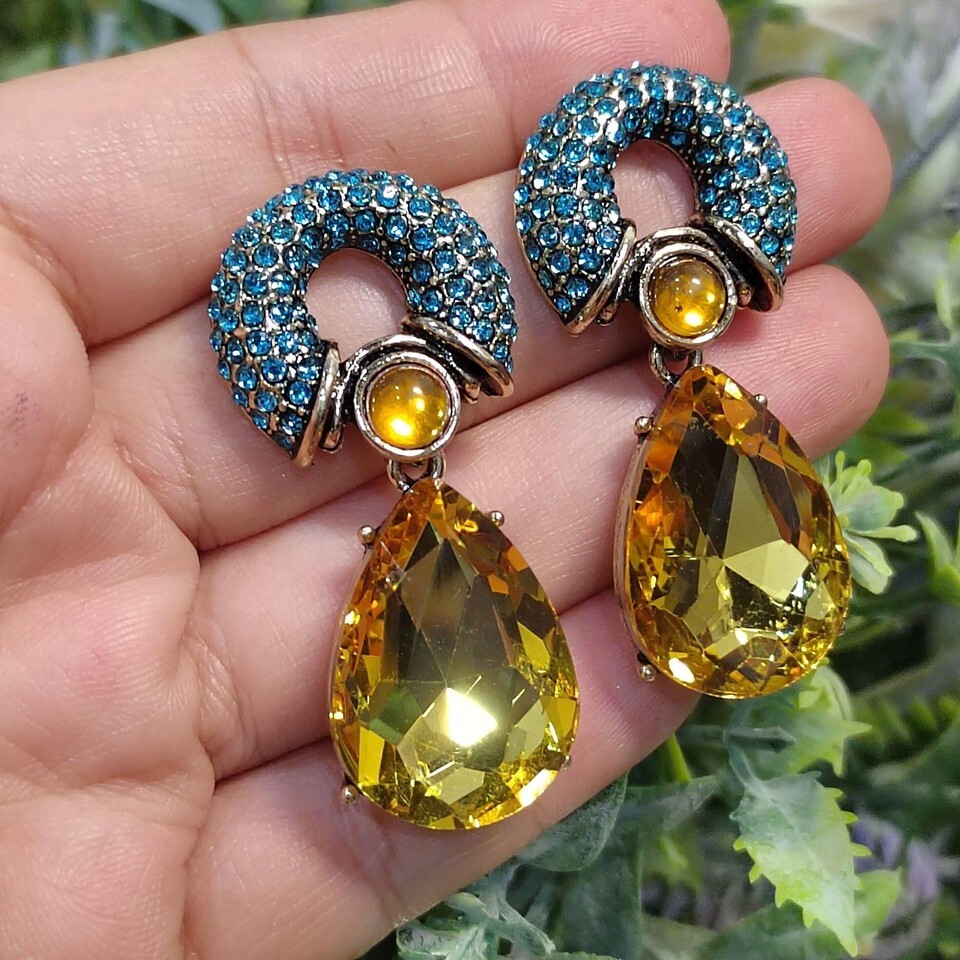 Make a bold and unforgettable impression with these exquisite dangle earrings, featuring a luxurious blend of vibrant blue pave-set rhinestones and brilliant yellow teardrop crystals. The chunky hoop silhouette adds volume and drama, while the 925 sterling silver stud ensures lasting comfort and hypoallergenic wear.
