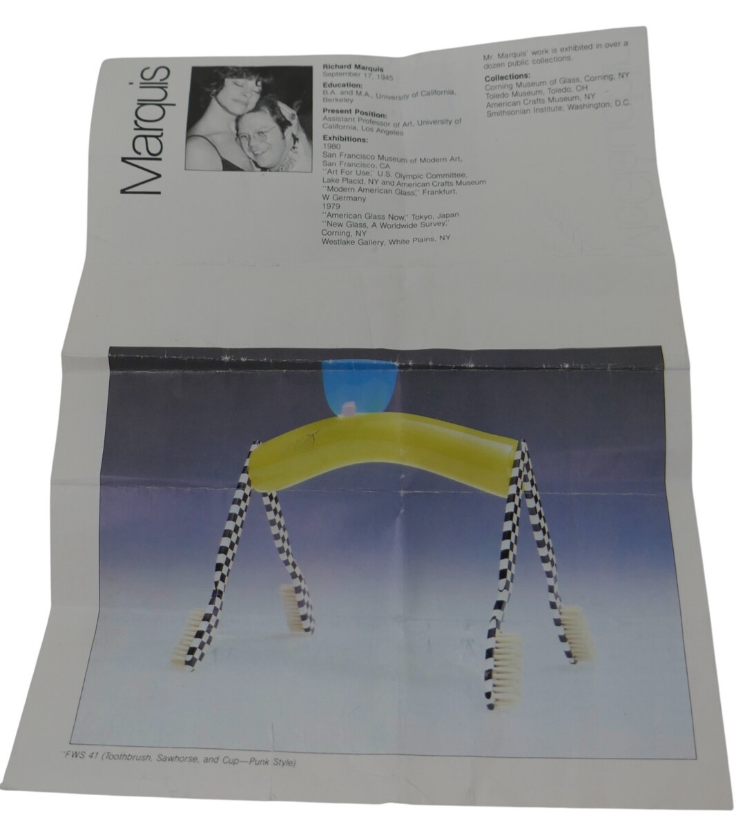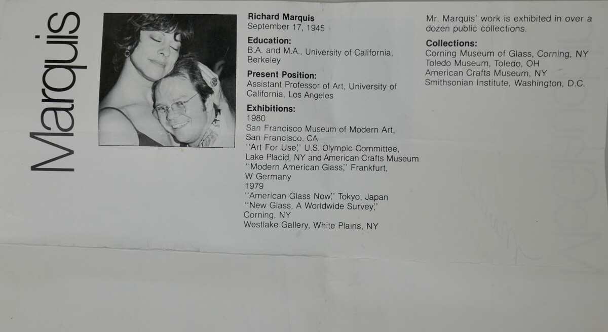 Experience the enchanting world of decorative art with the Richard Marquis Studio Art Glass Marble. This measures approx. 23.24mm wide with a few bubbles from manufacturing. Crafted by the renowned glass artist Richard Marquis, this exquisite piece showcases a mesmerizing swirl pattern, making it a standout addition to any collection or display. The last 2 pics are an informational sheet from the art gallery where the marbles were purchased back in the 1980's and not included.