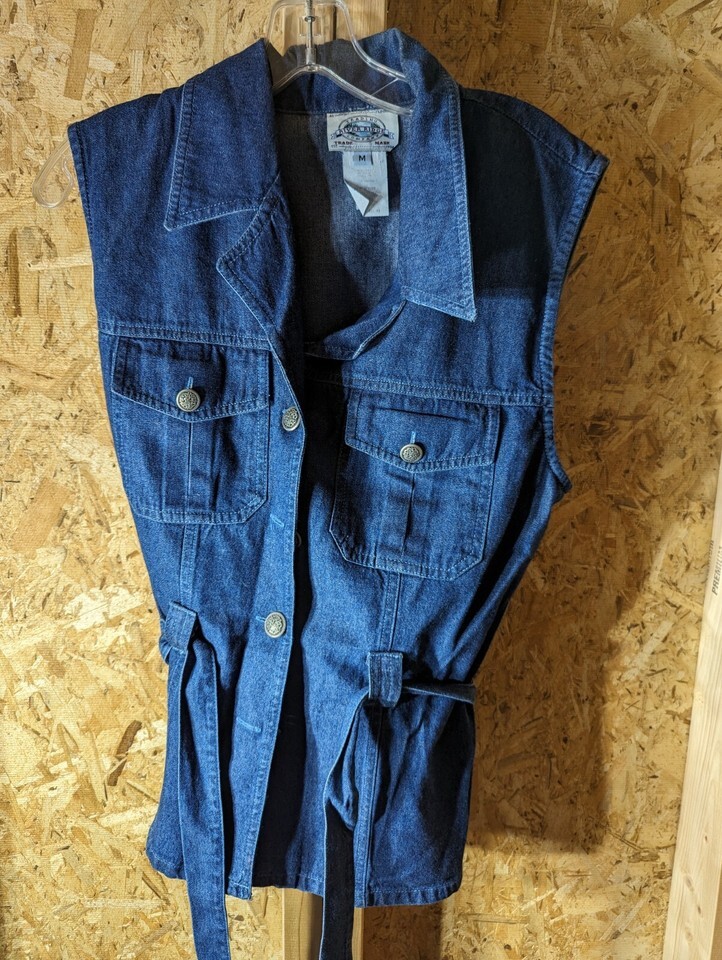 Add a touch of vintage charm to your wardrobe with this stylish River Ridge Trading Company ladies denim sleeveless top. Made of 100% cotton denim fabric, this top comes in a beautiful shade of blue and features a collared neckline with button closure. The top is belted and has pockets, making it both fashionable and functional.