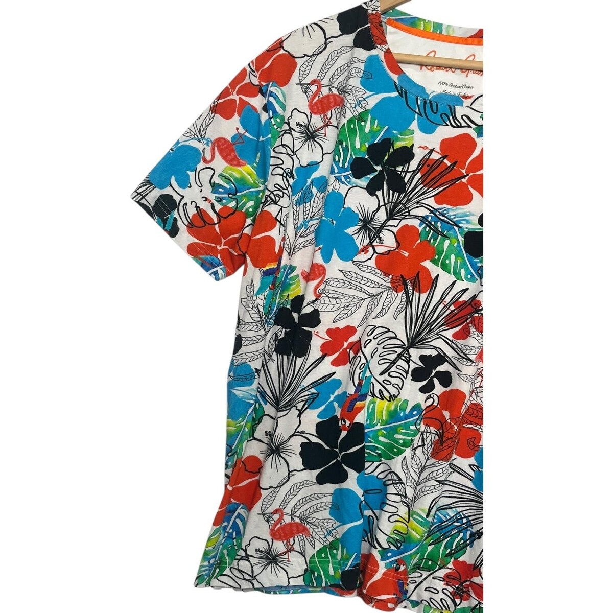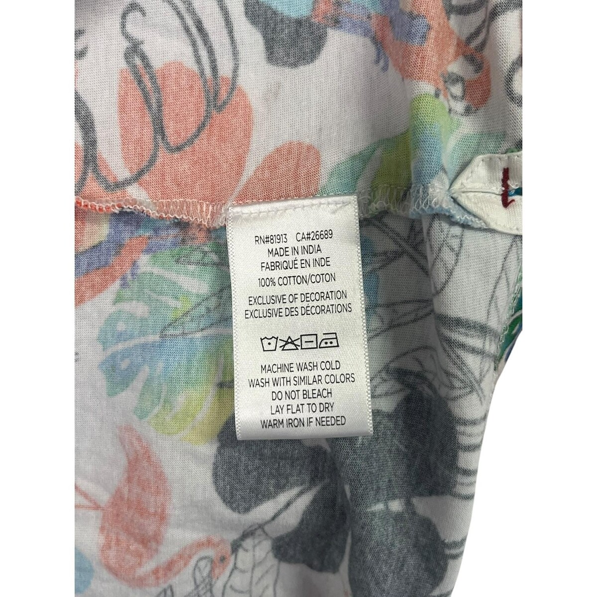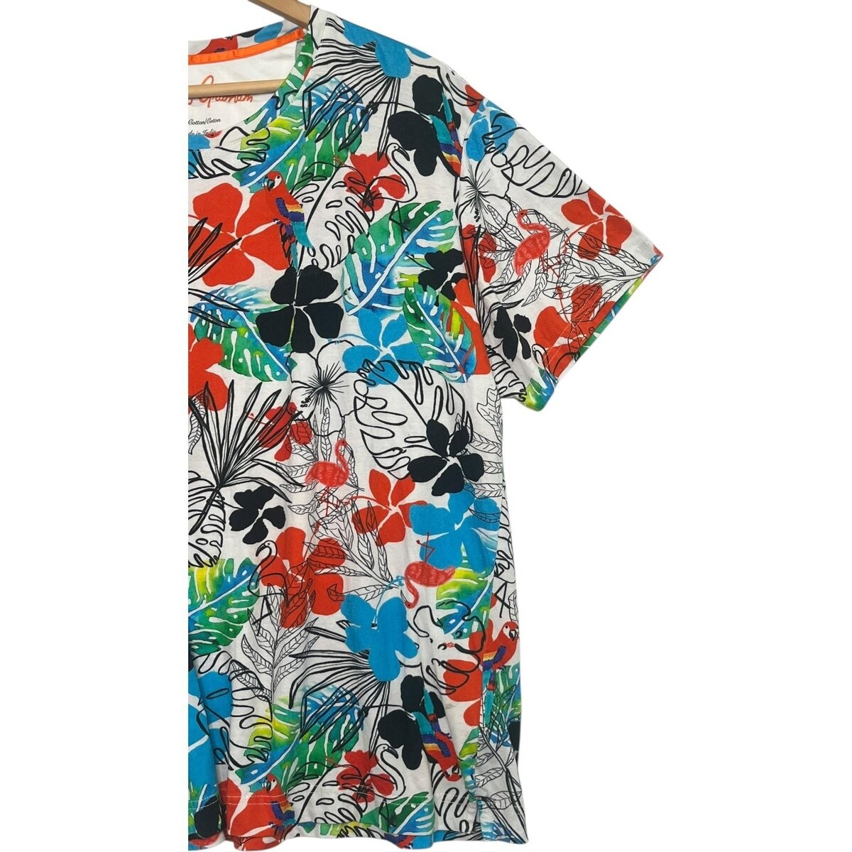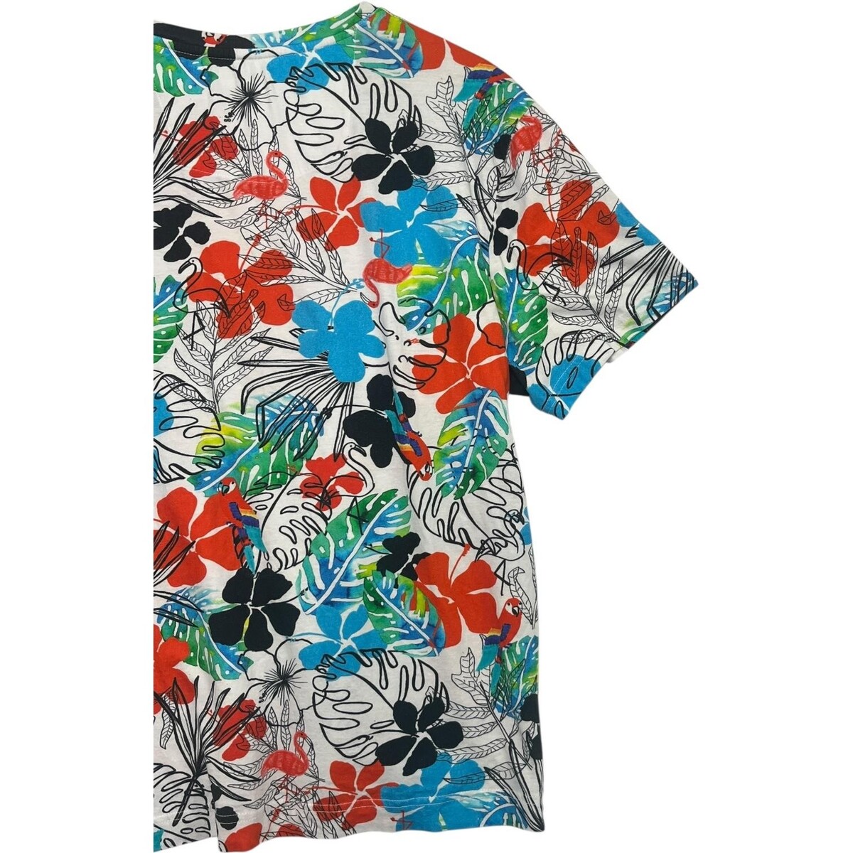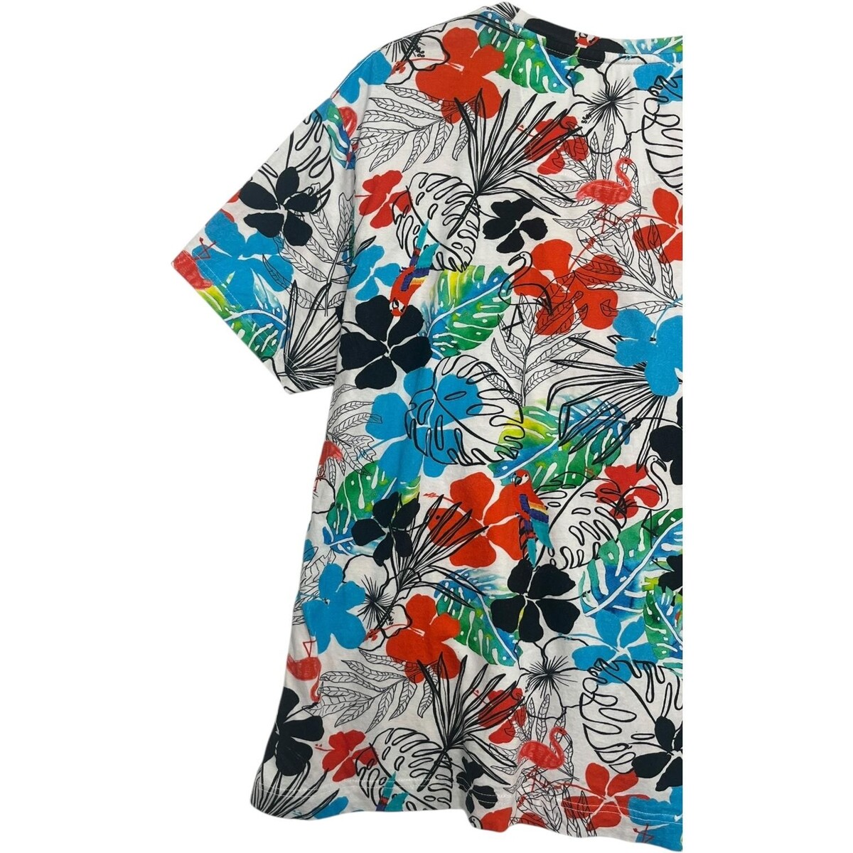 Color/Pattern: White base with multicolor print (red, blue, green, black) tropical flowers and leaves